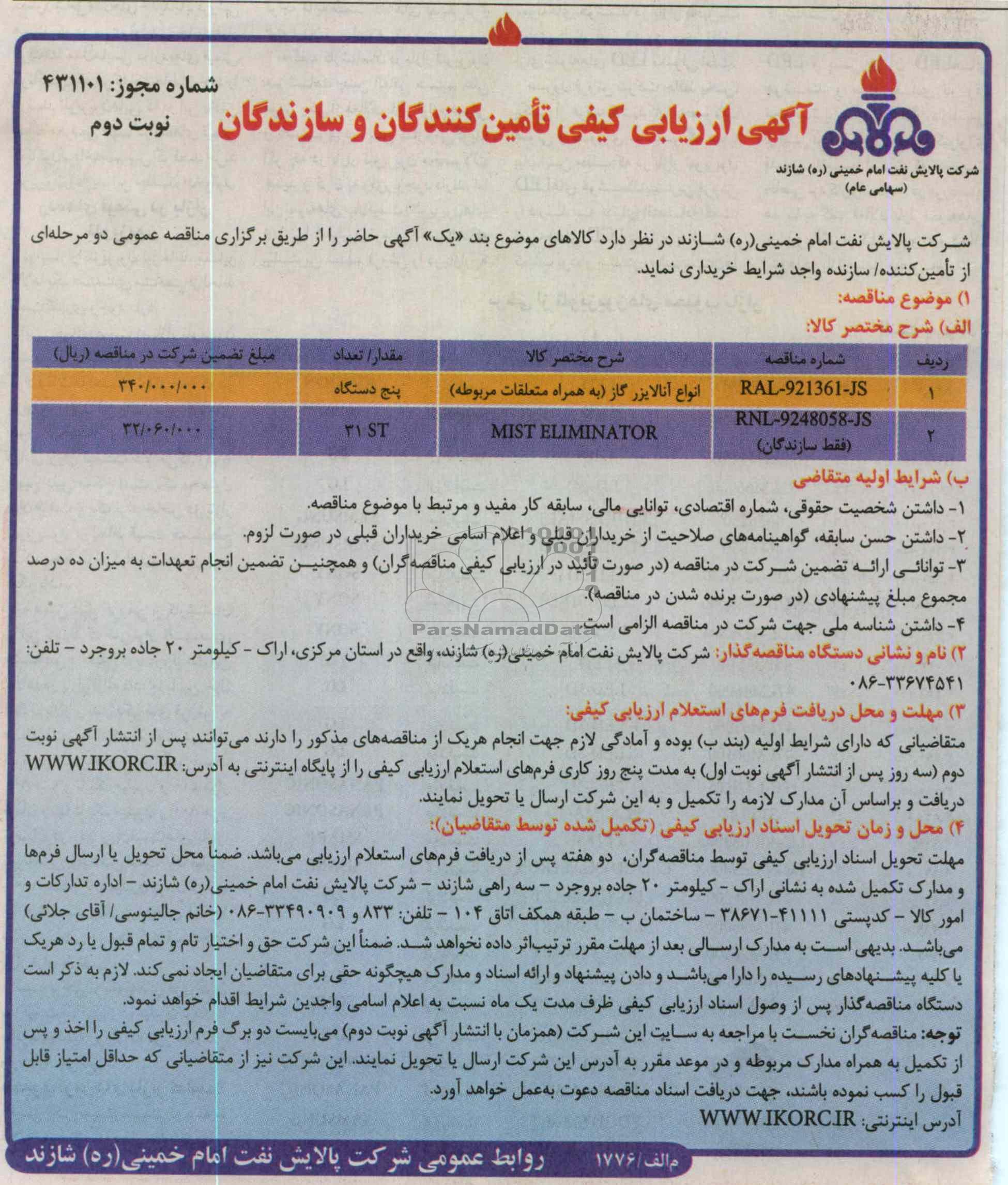 شرکت پالایش نفت امام خمینی (ره) شازند در نظر دارد کالاهای موضوع بند یک آگهی حاضر را از طریق برگزاری مناقصه عمومی دو مرحله ای از تامین کننده/ سازنده واجد شرایط خریداری نماید.