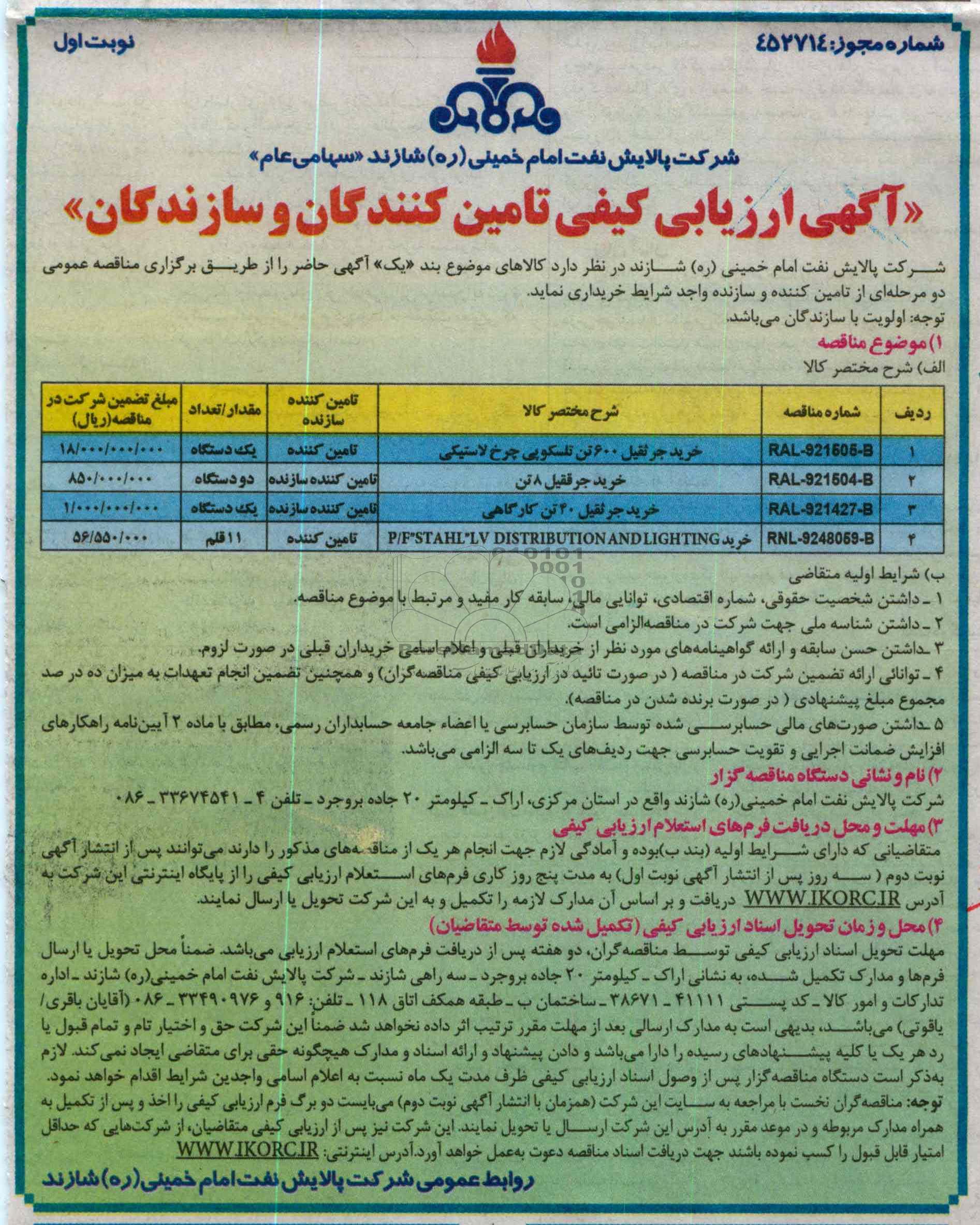نام و نشانی دستگاه مناقصه گزار: شرکت پالایش نفت امام خمینی (ره) شازند واقع در استان مرکزی اراک - کیلومتر 20 جاده بروجرد - تلفن 4-33674541-086