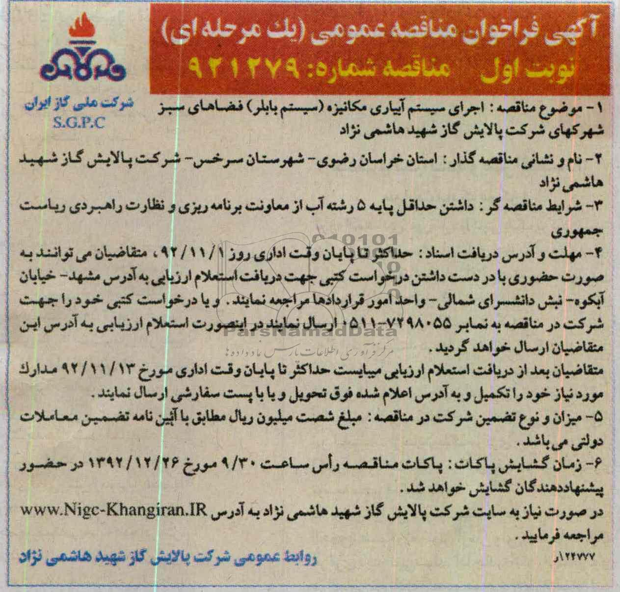 موضوع مناقصه: اجرای سیستم آبیاری مکانیزه (سیستم بابلر) فضاهای سبز شهرکهای شرکت پالایش گاز شهید هاشمی نژاد