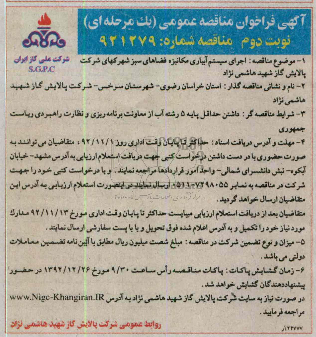 موضوع مناقصه: اجرای سیستم آبیاری مکانیزه فضاهای سبز شهرکهای شرکت پالایش گاز شهید هاشمی نژاد