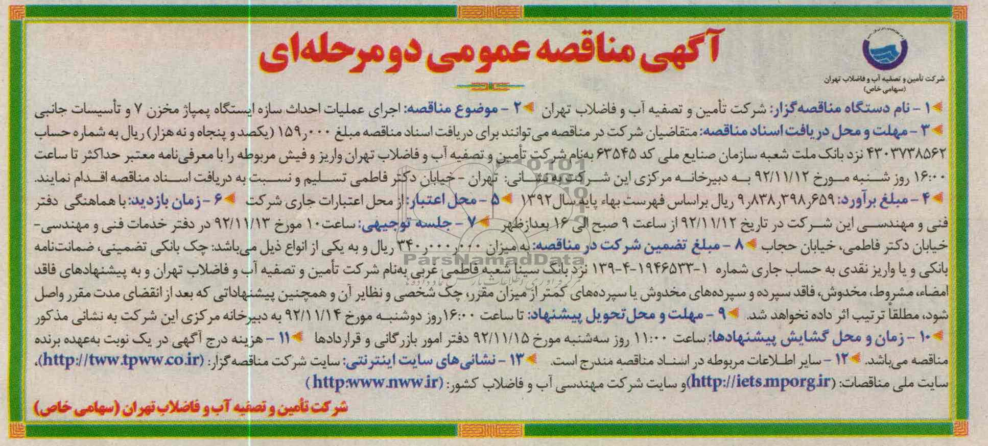 مهلت، محل تحویل اسناد مناقصه : متقاضیان شرکت در مناقصه می توانند برای دریافت اسناد مناقصه مبلغ 159.000 (یکصدوپنجاه و نه هزار) ریال به حساب شماره 4303738562 نزد بانک ملت شعبه سازمان صنایع ملی کد 63545 به نام شرکت تامین و تصفیه آب و فاضلاب تهران، واریز و فیش مربوطه را با معرفی نامه معتبر حداکثر تا ساعت 16 روز شنبه مورخ 92.11.12 به دبیرخانه مرکزی این شرکت به شانی: تهران - خیابان دکتر فاطمی تسلیم و نسبت به دریافت اسناد مناقصه اقدام نمایند.
