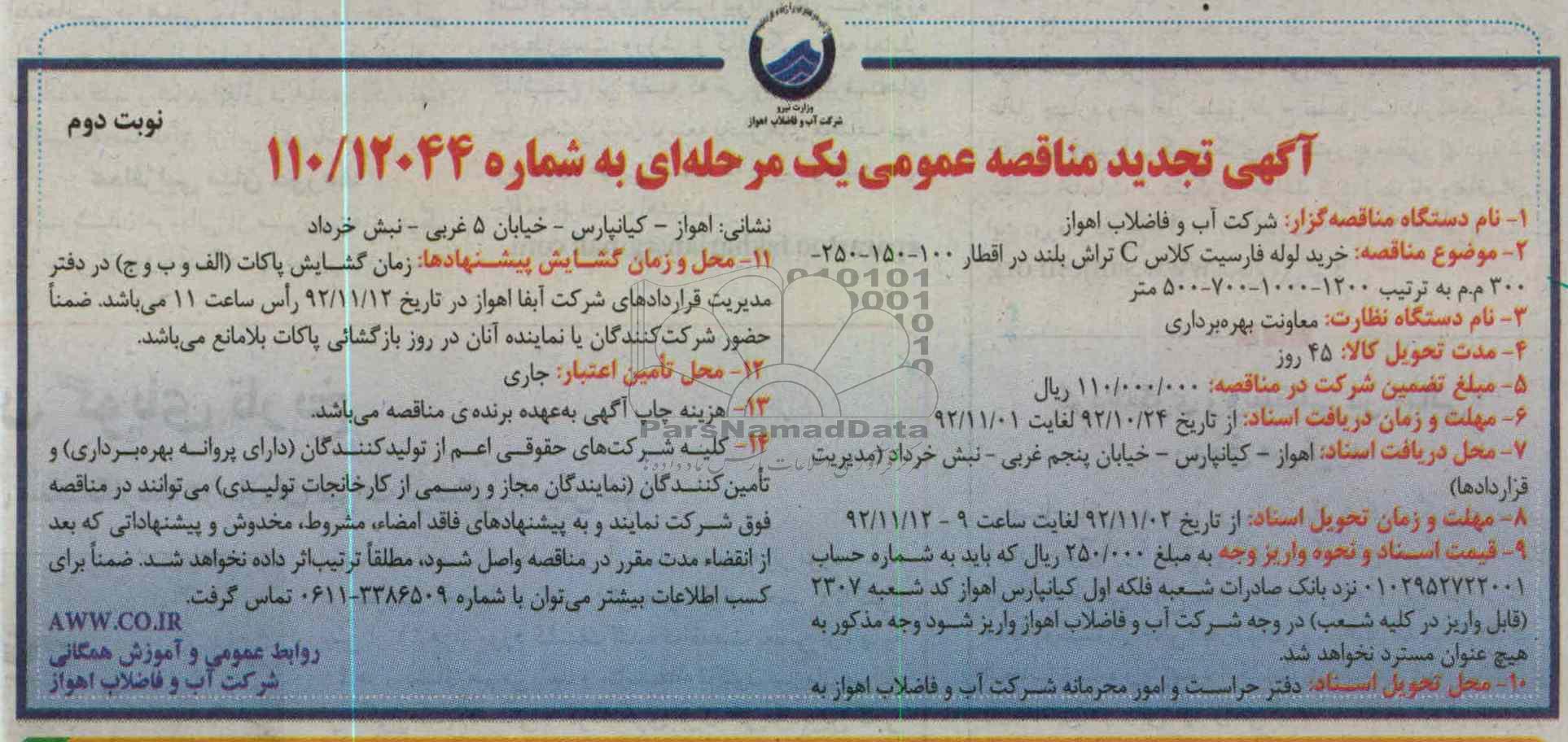 مهلت و زمان تحویل اسناد: از تاریخ 92.10.2 لغایت 9 مورخ 92.11.12