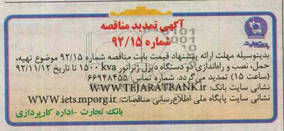 علاقهمندان میتوانند جهت دریافت اسناد و اطلاعات تکمیلی، آگهی تمدید مناقصه با سامانه مناقصات و مزایدات ایران پارسنماد داده ها 88349670 تماس حاصل نمایند.