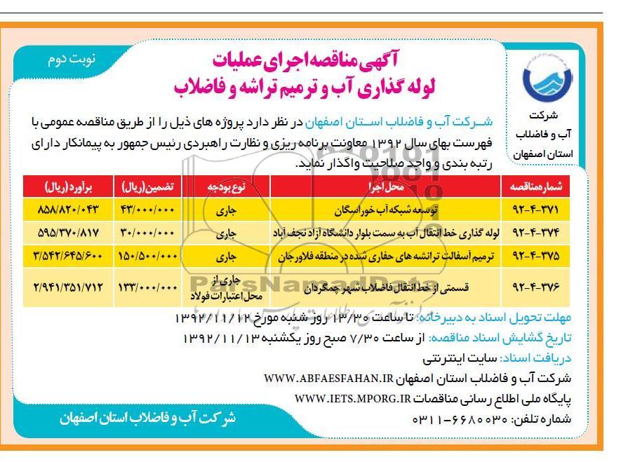 | 92-4-371 | توسعه شبکه آب خوراسگان | جاری | 43.000.000 | 858.820.043 |