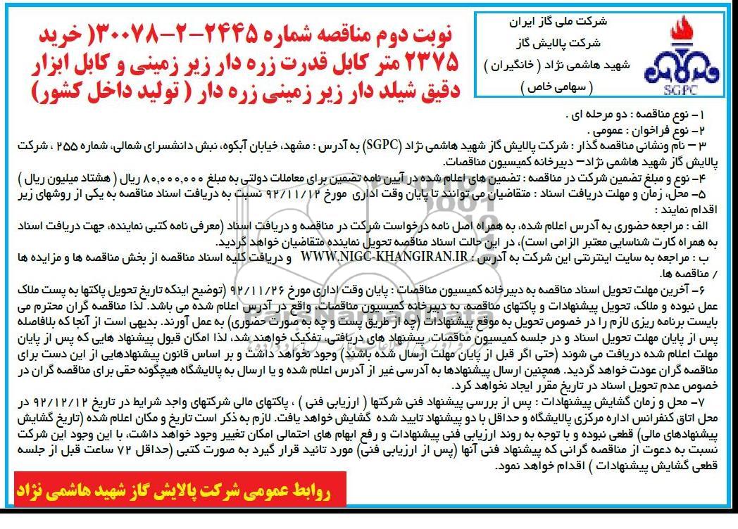 آگهی مناقصه , خرید 2375 متر کابل قدرت زره دار زیرزمینی و کابل ابزار دقیق شیلد دار زیرزمینی زره دار