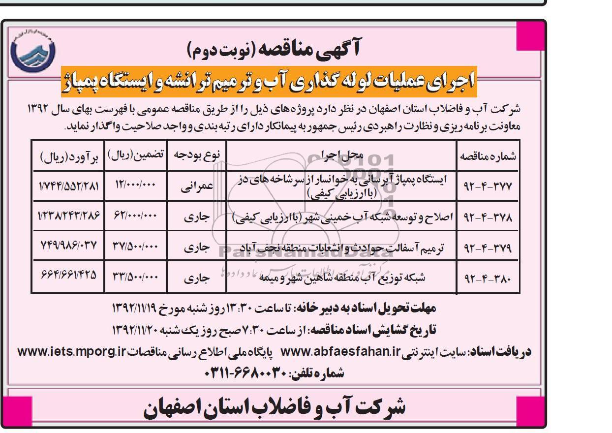 | 92-4-380 | شبکه توزیع آب منطقه شاهین شهر و میمه | جاری | 33.500.000 | 664.661.425 |