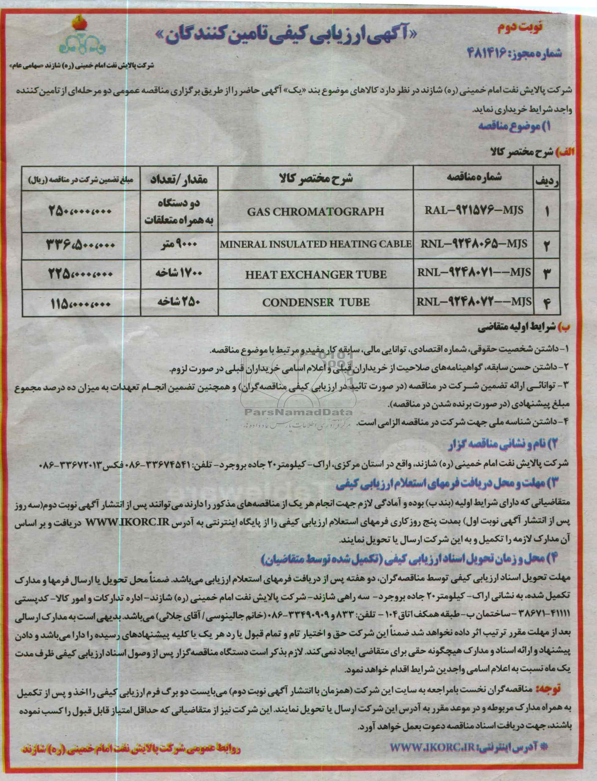 شرکت پالایش نفت امام خمینی (ره) شازند در نظر دارد کالای موضوع بند یک آگهی حاضر را از طریق برگزاری مناقصه عمومی دو مرحله ای از تامین کننده واجد شرایط خریداری نماید.