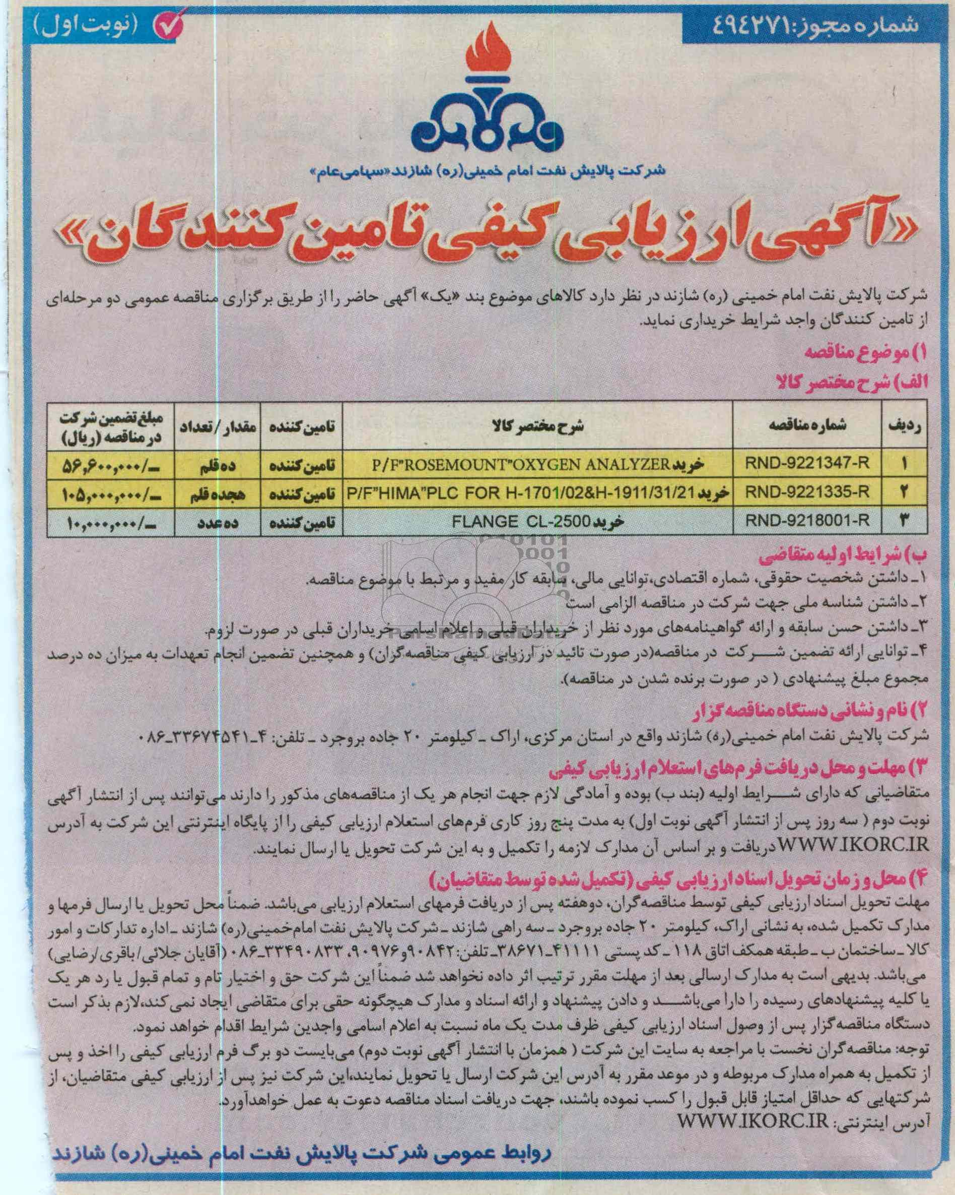 شرکت پالایش نفت امام خمینی (ره) شازند در نظر دارد کالای موضوع بند یک آگهی حاضر را از طریق برگزاری مناقصه عمومی دو مرحله ای از تامین کننده واجد شرایط خریداری نماید.