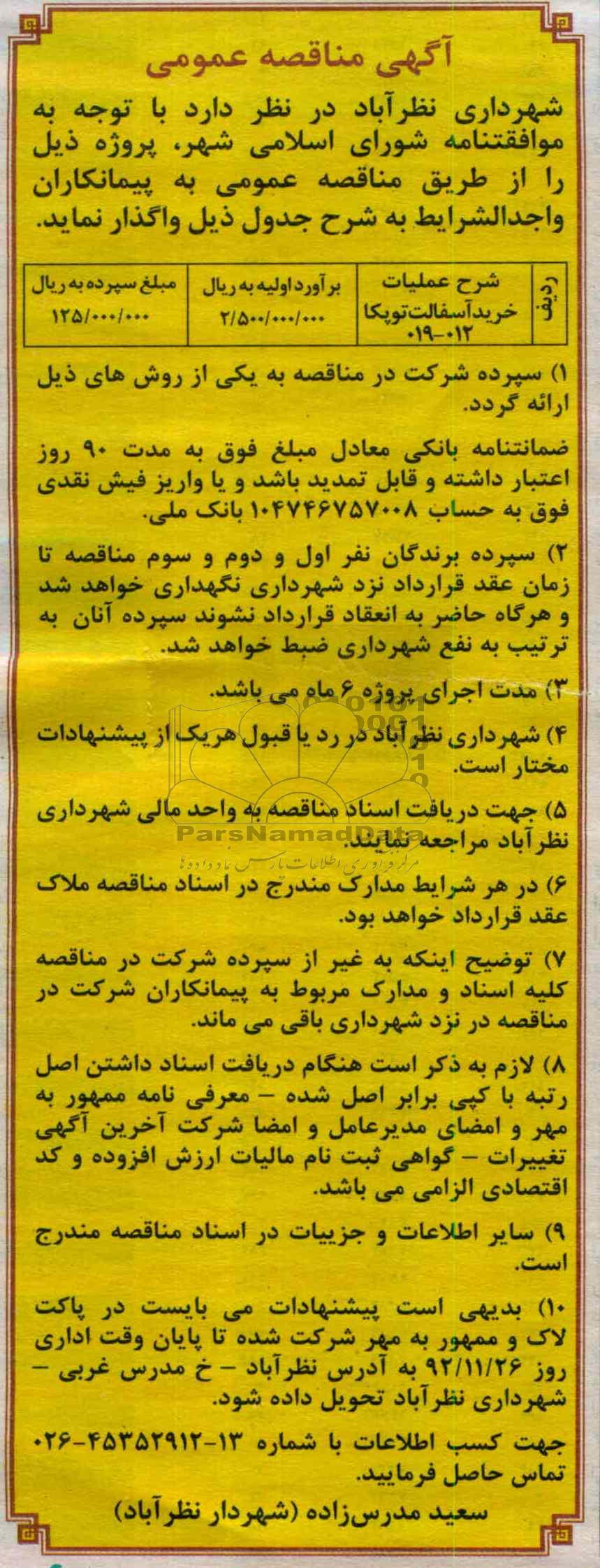 آگهی مناقصه عمومی, خرید آسفالت توپکا 012- 019