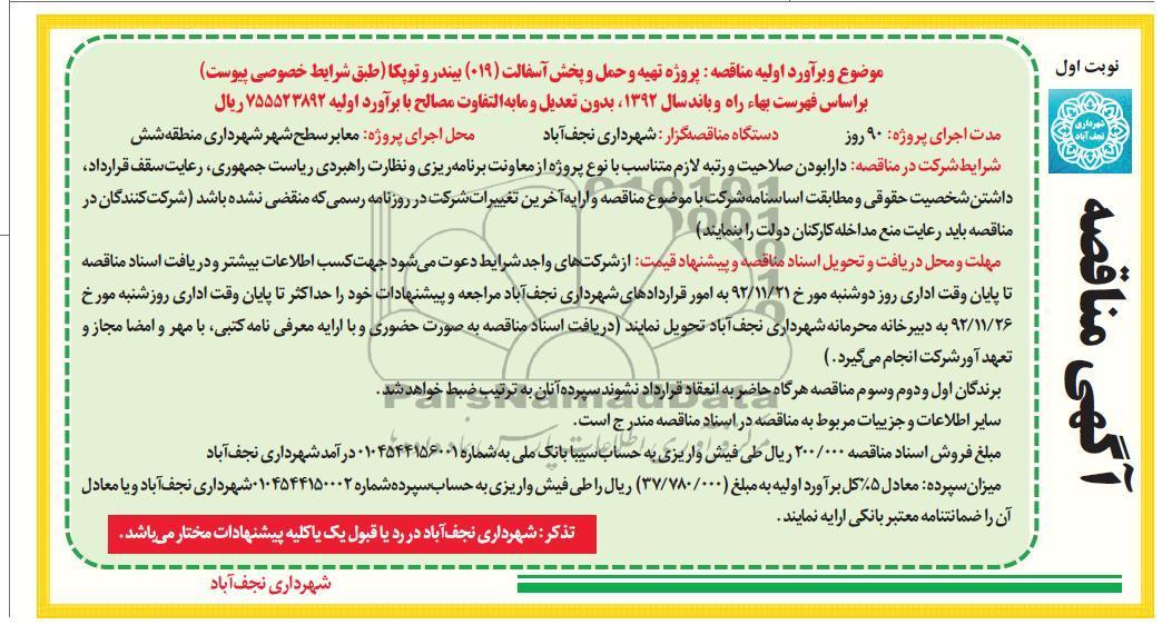 آگهی مناقصه, تهیه و حمل و پخش آسفالت (019) بیندر و توپکا