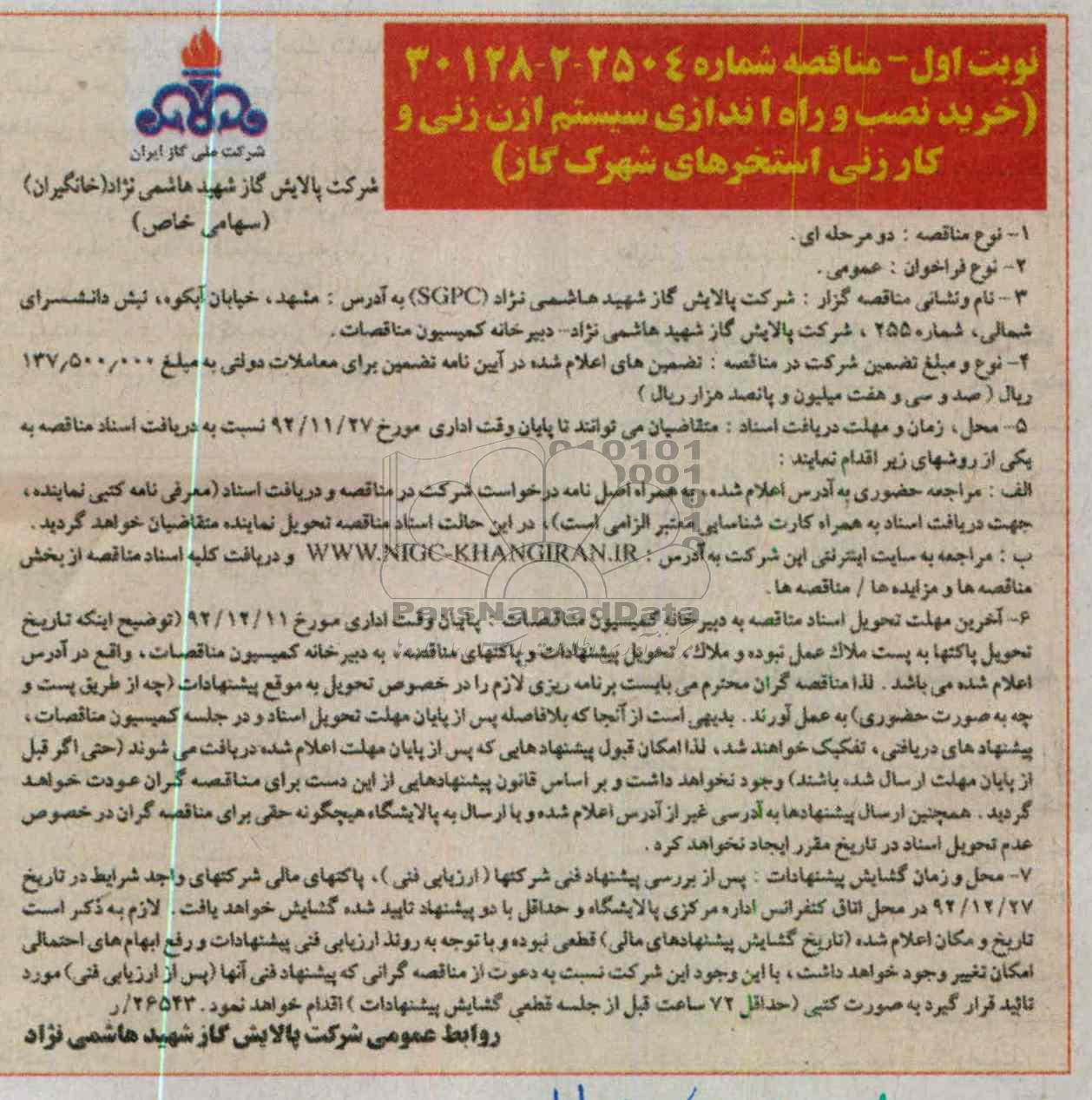نام و نشانی مناقصه گذار: شرکت پالایش گاز شهید هاشمی نژاد SGPC به آدرس مشهد خیابان آبکوه نبش دانشسرای شمالی شماره 255 شرکت پالایش گاز شهید هاشمی نژاد دبیرخانه کمیسیون مناقصات