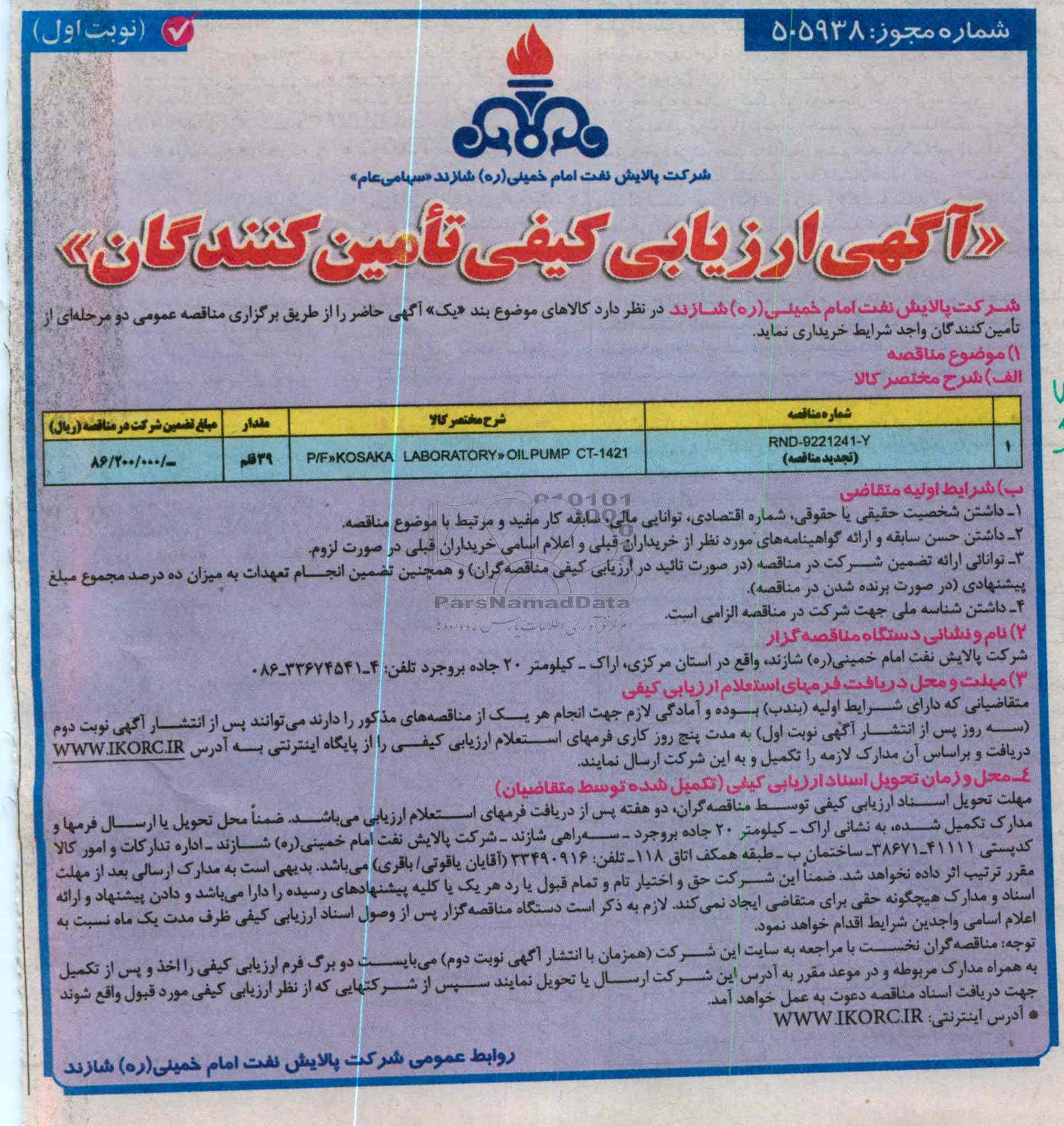 متقاضیانی که دارای شرایط اولیه بند ب بوده و آمادگی لازم جهت انجام هر یک از مناقصات مذکور را دارند می توانند پس از انتشار آگهی نوبت دوم (سه روز پس از انتشار آگهی نوبت اول) به مدت پنج روز کاری فرمهای استعلام ارزیابی کیفی را از پایگاه اینترنتی این شرکت به آدرس WWW.IKORC.IR دریافت و بر اساس آن مدارک لازمه را تکمیل و به این شرکت تحویل یا ارسال نمایند
