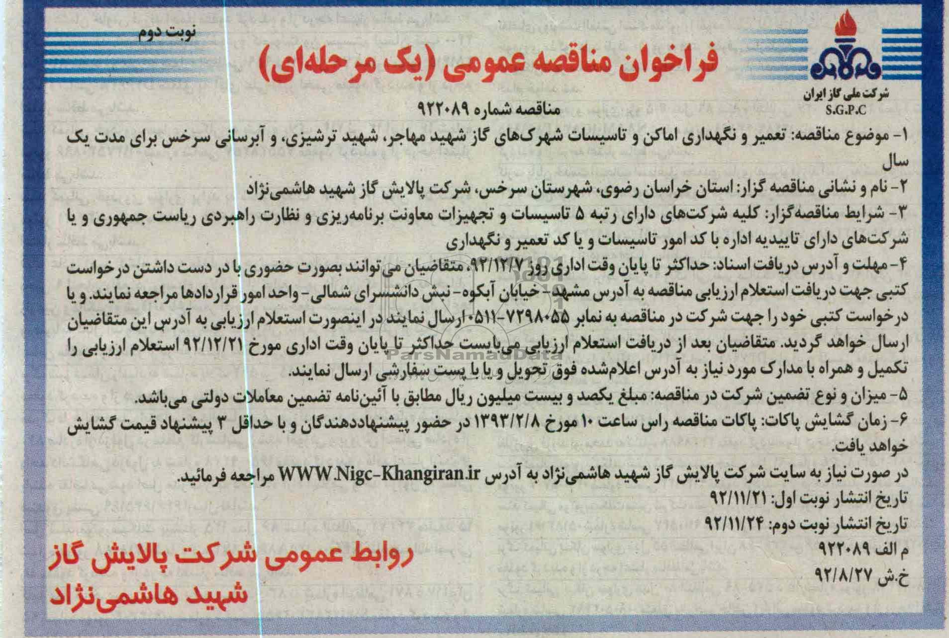 موضوع مناقصه: تعمیر و نگهداری اماکن و تاسیسات شهرکهای گاز شهید مهاجر ، شهید ترشیزی ، و آبرسانی سرخس برای مدت یکسال