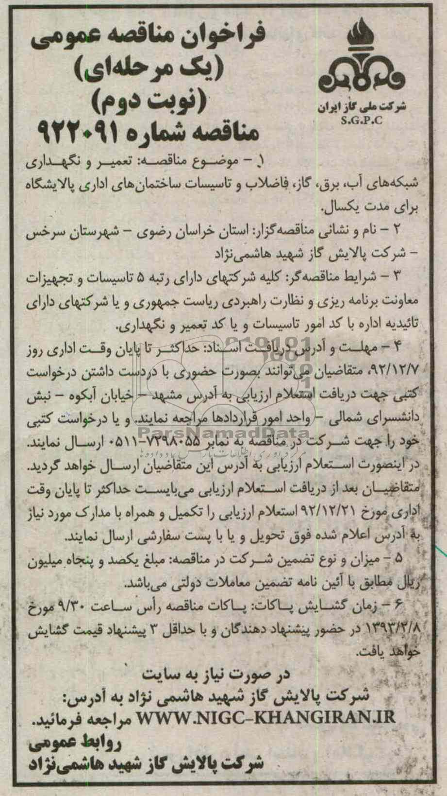 موضوع مناقصه تعمیر و نگهداری شبکه های آب،برق،گاز،فاضلاب و تاسیسات ساختمان های اداری پالایشگاه برای مدت یک سال