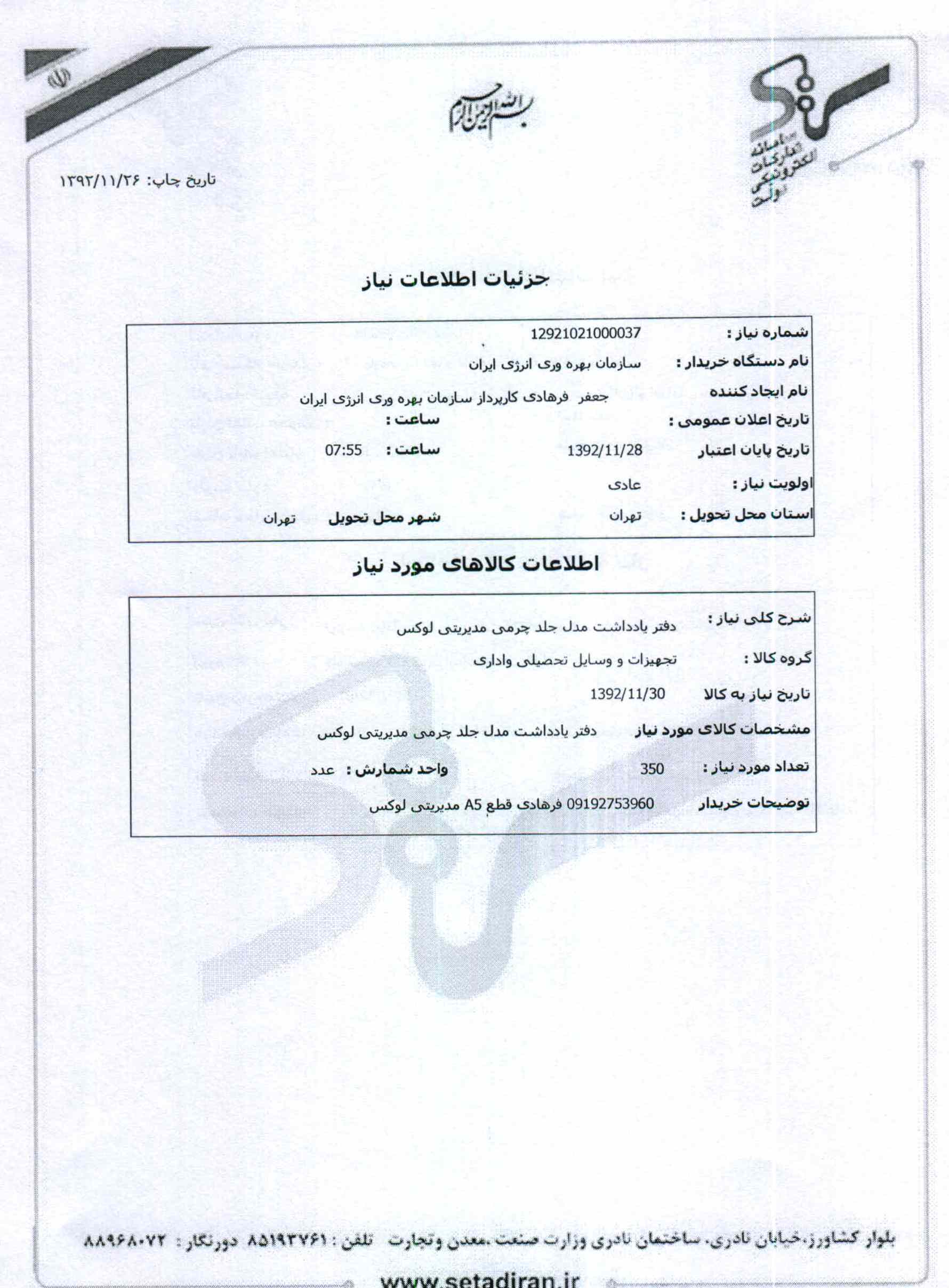 جهت دریافت اطلاعات کامل این آگهی به سایت WWW.SETADIRAN.IR مراجعه فرمایید.