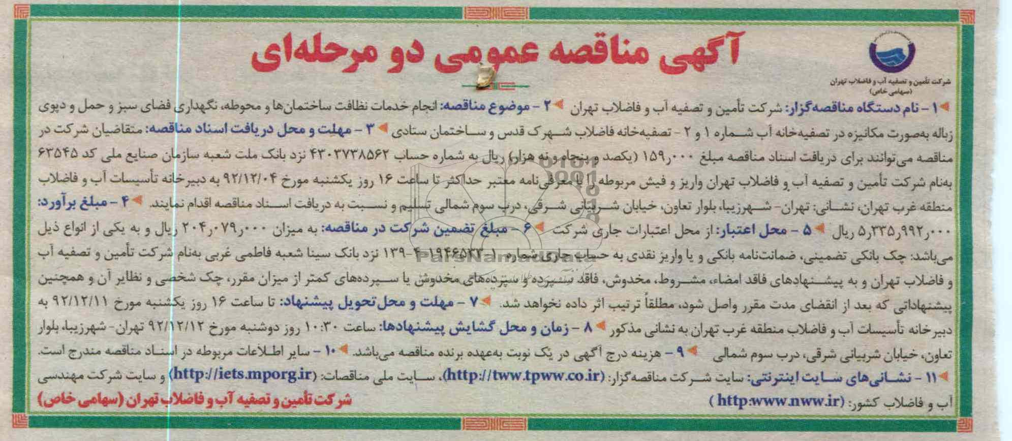 مهلت و محل دریافت اسناد مناقصه: متقاضیان شرکت در مناقصه می توانند برای دریافت اسناد مناقصه مبلغ 159.000(یکصد و پنجاه و نه هزار ) ریال به حساب 4303738562 نزد بانک ملت شعبه سازمان صنایع ملی کد 63545 به نام شرکت تامین و تصفیه آب و فاضلاب تهران واریز و فیش مربوطه را با معرفی نامه معتبر حداکثر تا ساعت 16 روز یکشنبه مورخ 92.12.4 به دبیرخانه تاسیسات آب و فاضلاب منطقه غرب تهران نشانی تهران شهر زیبا ، بلوار تعاون ، خیابان شربیانی شری ، درب سوم شمالی تسلیم و نسبت به دریافت اسناد مناقصه اقدام نمایند.