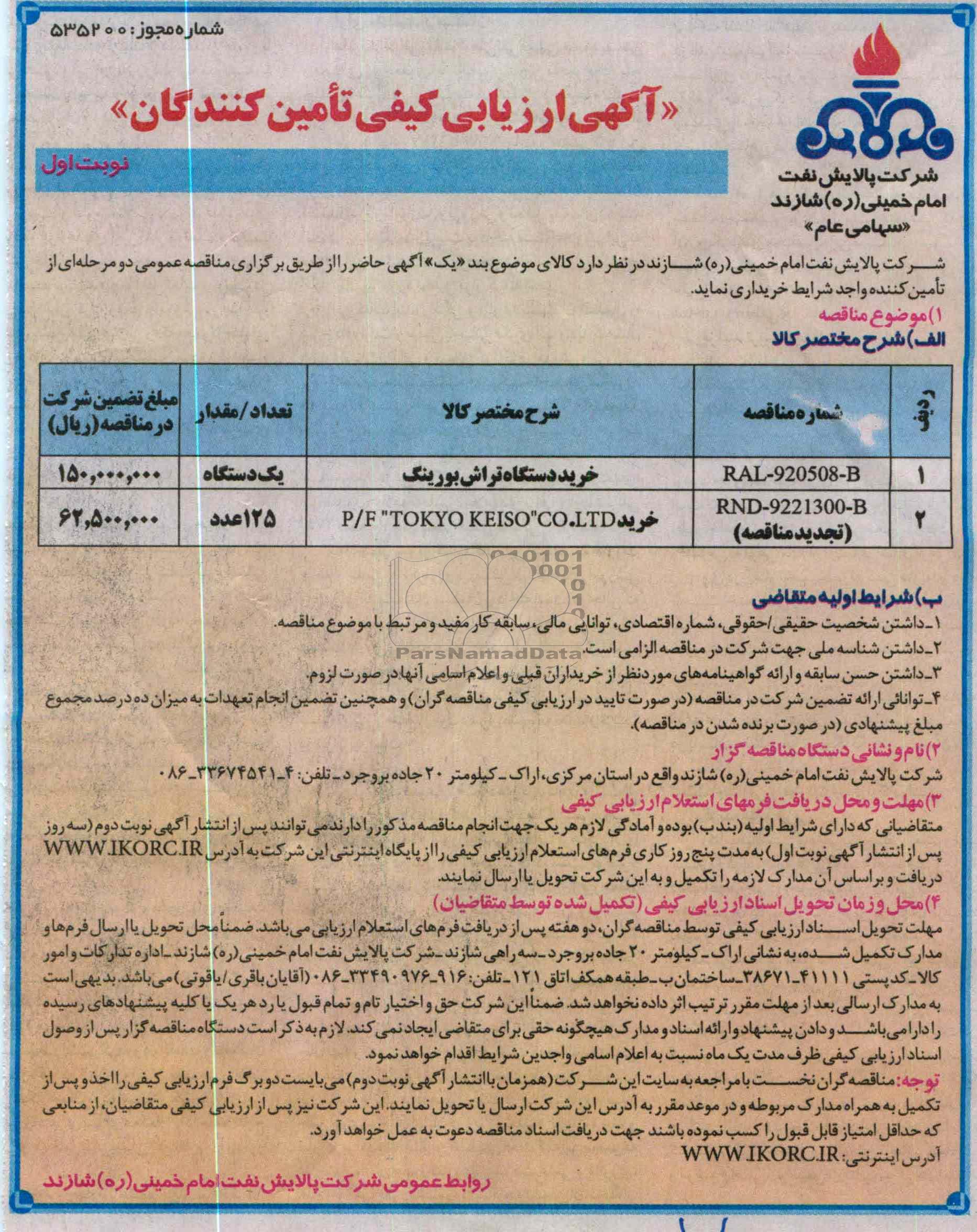 شرکت پالایش نفت امام خمینی ره شازند در نظر دارد کالاهای موضوع بند یک آگهی حاضر را از طریق برگزاری مناقصه عمومی دو مرحله ای از تامین کننده واجد شرایط خریداری نماید