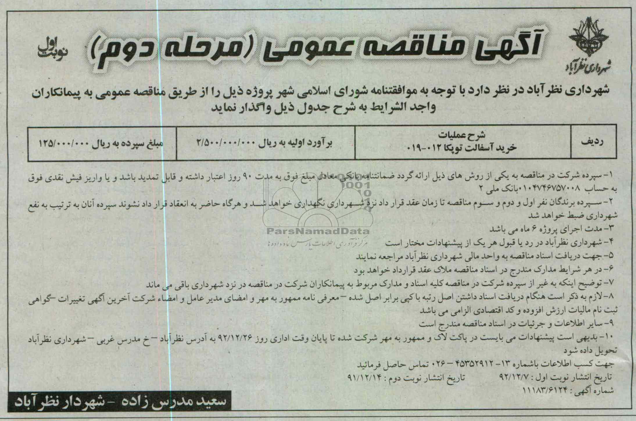 آگهی مناقصه عمومی, خرید آسفالت توپکا 012- 019