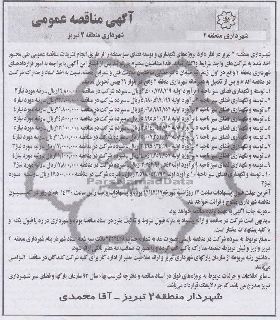 شهرداری منطقه 2 تبریز در نظر دارد پروژه های نگهداری و توسعه فضای سبز منطقه را از طریق انجام تشریفات مناقصه عمومی طی مجوز اخذ شده به شرکتهای واجد شرایط واگذار نماید . لذا متقاضیان محترم می توانند پس از انتشار این آگهی با مراجعه به امور قراردادهای شهرداری منطقه 2 واقع در اول زعفرانیه حیابان دکتر حسابی ساختمان معاونت فنی و عمرانی منطقه , نسبت به اخذ اسناد و مدارک شرکت در مناقصه اقدام و پس از تکمیل به دبیرخانه شهرداری منطقه 2 واقع در بلوار 29 بهمن تحویل نمایند