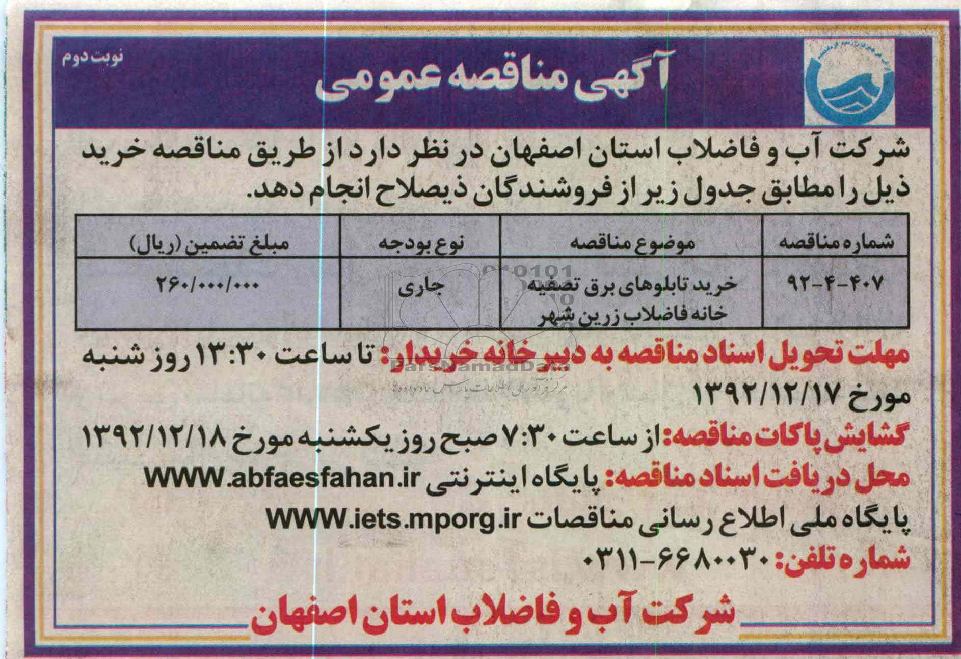 | 407-4-92 | خرید تابلوهای برق تصفیه خانه فاضلاب زرین شهر | جاری | 260.000.000 |