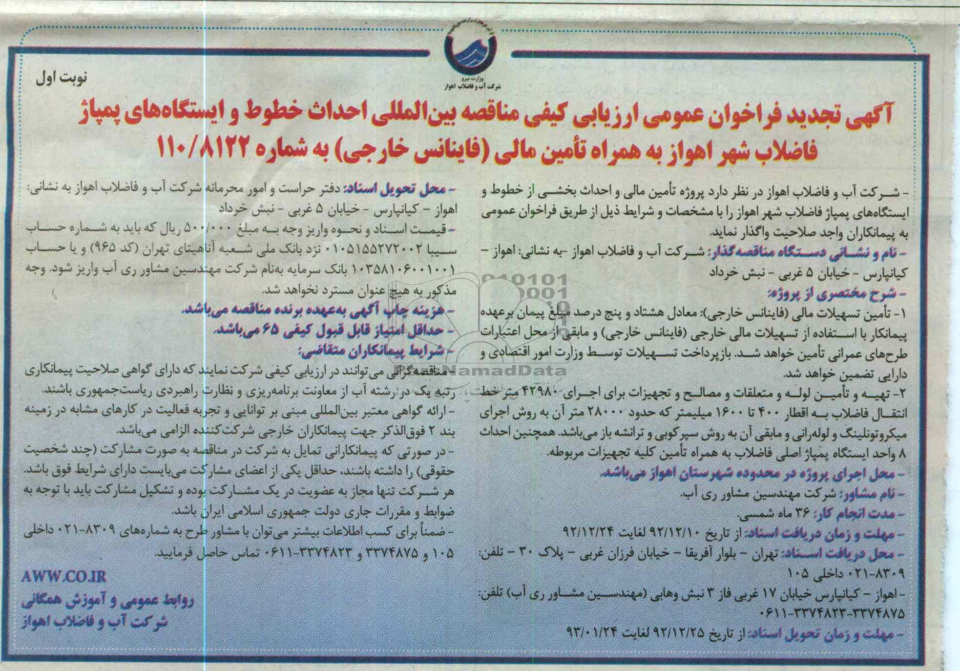 نام ون شانی دستگاه مناقصه گذار: شرکت آب و فاضلاب اهواز- به نشانی: اهواز- کیانپارس- خیابان 5 غربی- نبش خرداد