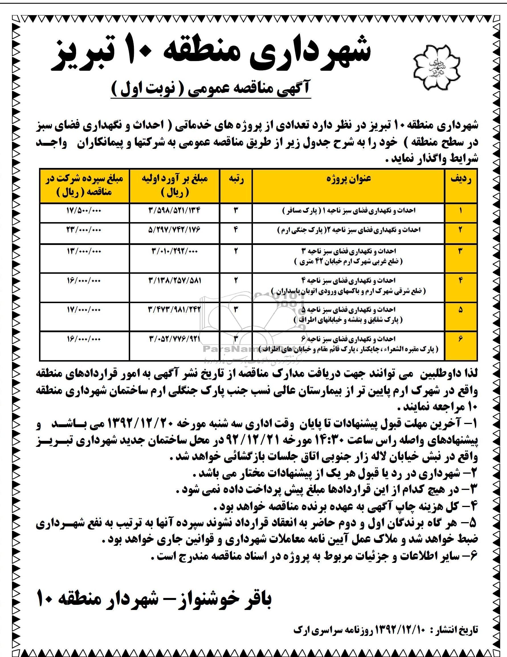 شهرداری منطقه ده تبریز درنظردارد تعدادی از پروژه های خدماتی احداث و نگهداری فضای سبز در سطح منطقه خود را به شرح جدول زیر از طریق مناقصه عمومی به شرکتها وپیمانکاران واجد شرایط واگذار نماید