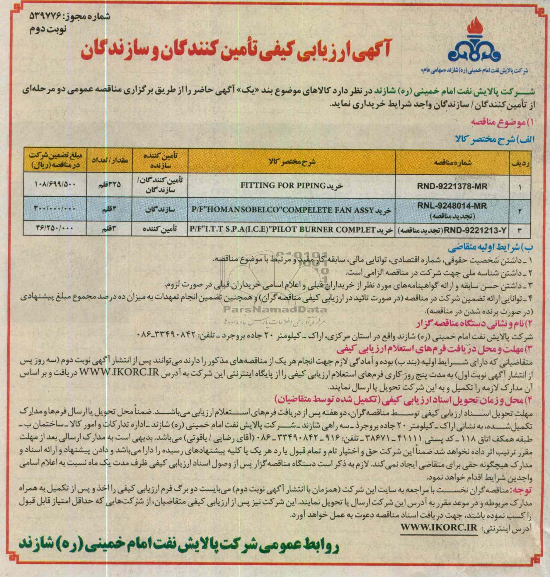 شرکت پالایش نفت امام خمینی ره شازند در نظر دارد کالاهای موضوع بند یک آگهی حاضر را از طریق برگزاری مناقصه عمومی دو مرحله ای از سازندگان و تولید کنندکان واجد شرایط خریداری نماید