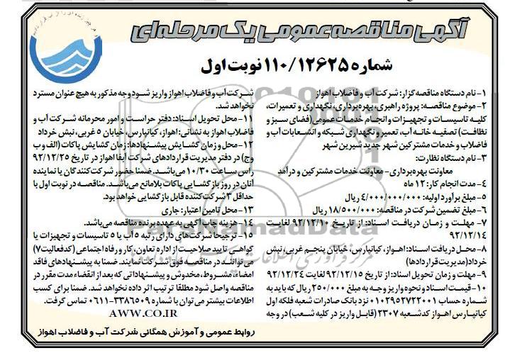 محل و زمان گشایش پیشنهادها: زمان گشایش پاکات در دفتر مدیریت امور قراردادهای شرکت آبفا اهواز در تاریخ 92.12.25 رأس ساعت 10:30 می باشد. ضمناً حضور شرکت کنندگان یا نماینده آنان در روز بازگشایی پاکات بلامانع می باشد. مناقصه در نوبت اول با حداقل 3 شرکت کننده قابل بازگشایی خواهد بود.