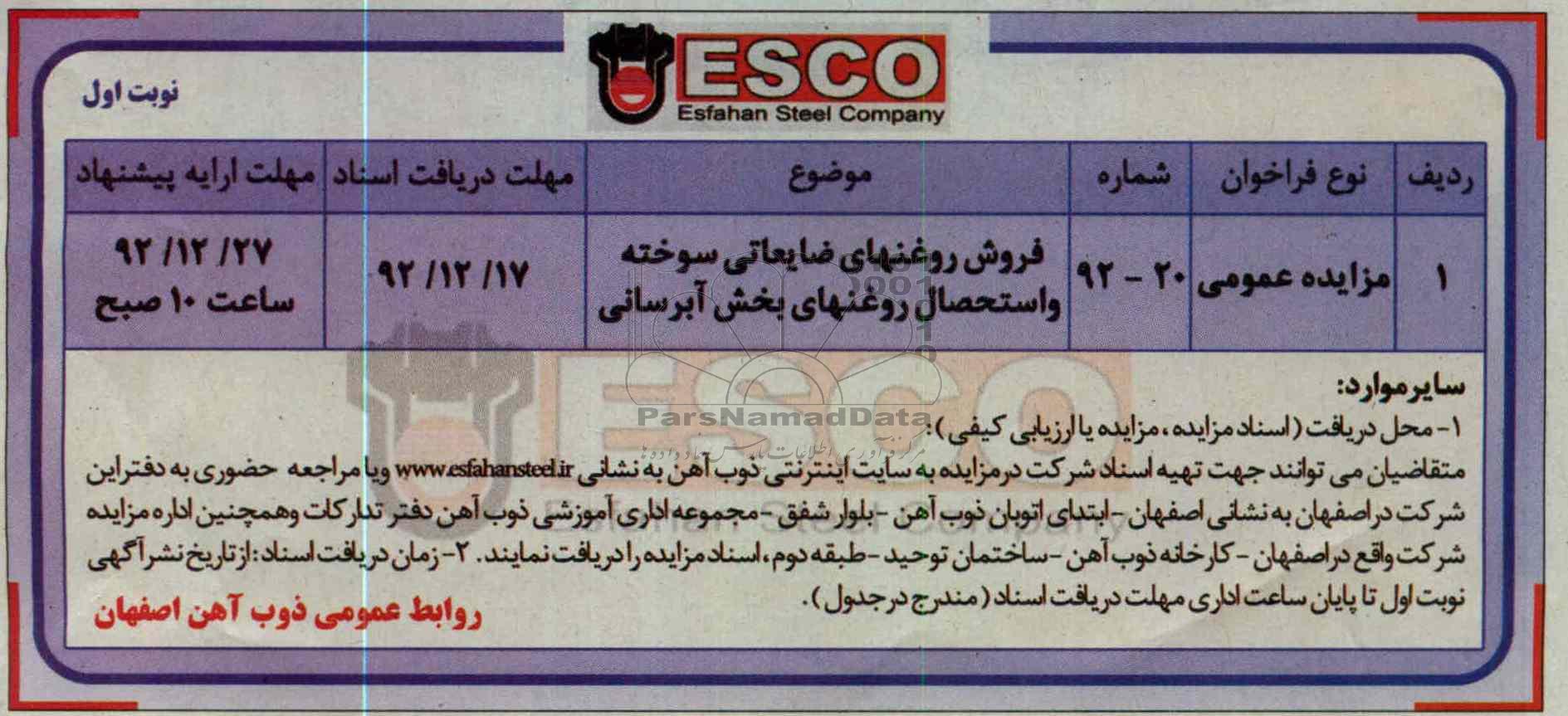 مزایده عمومی اگهی مزایده برگزار میگردد. از کلیه افراد متخصص و شرکتهای واجد شرایط دعوت به عمل میآید تا در این مزایده با کد خبرگزاری پارس نماد : 311182 شرکت نمایند تاریخ شروع مزایده : 1392/12/13 مهلت شرکت در مزایده: تا پایان روز 1392/12/17 مکان برگزاری اموال واگذاری استانهای اصفهان و دستهبندیهای مربوط به این حراجی ضایعات نفت ، گاز و پتروشیمی, روغن میباشد.