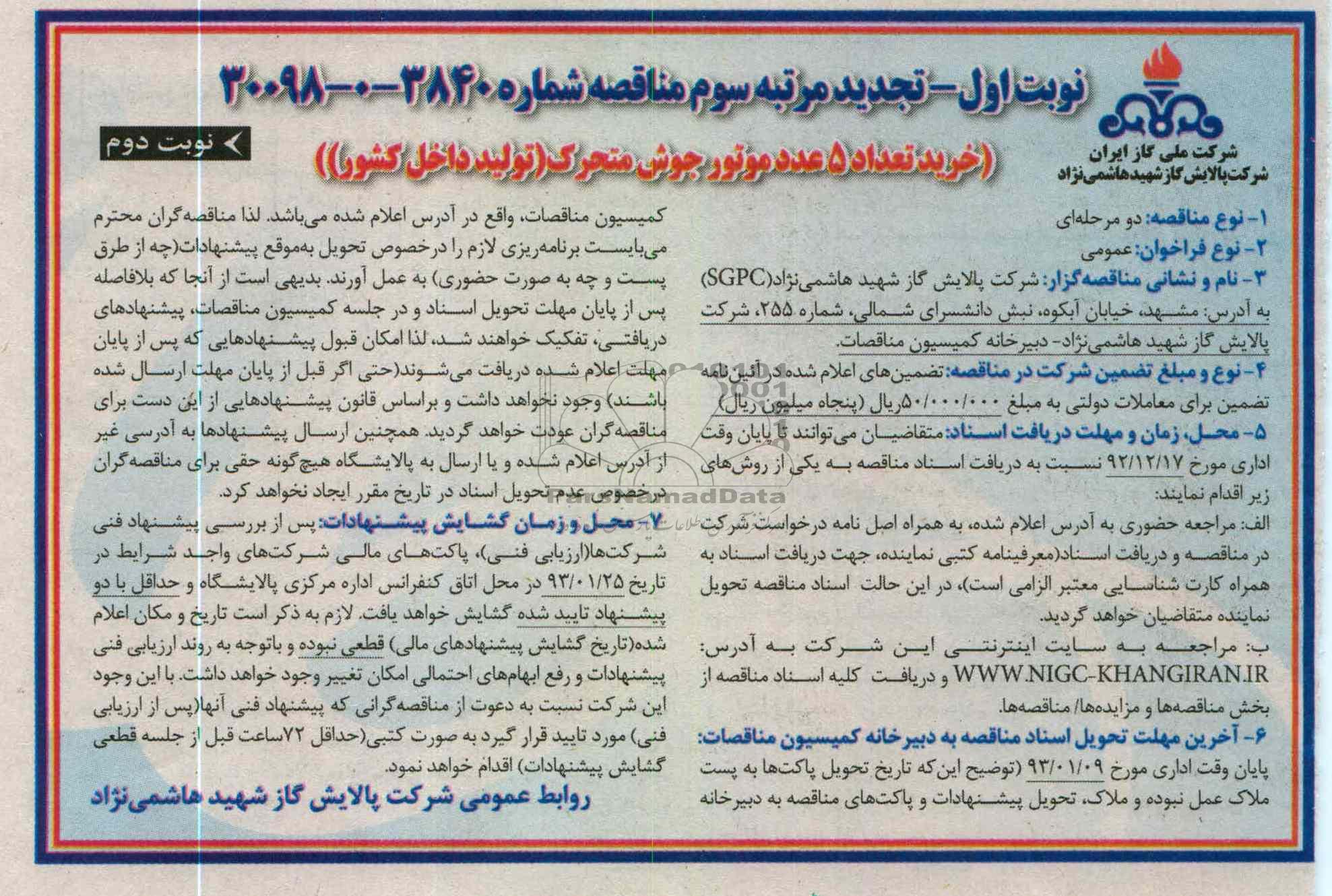 نام و نشانی مناقصه گذار: شرکت پالایش گاز شهید هاشمی نژاد SGPC به آدرس مشهد خیابان آبکوه نبش دانشسرای شمالی شماره 255 شرکت پالایش گاز شهید هاشمی نژاد دبیرخانه کمیسیون مناقصات