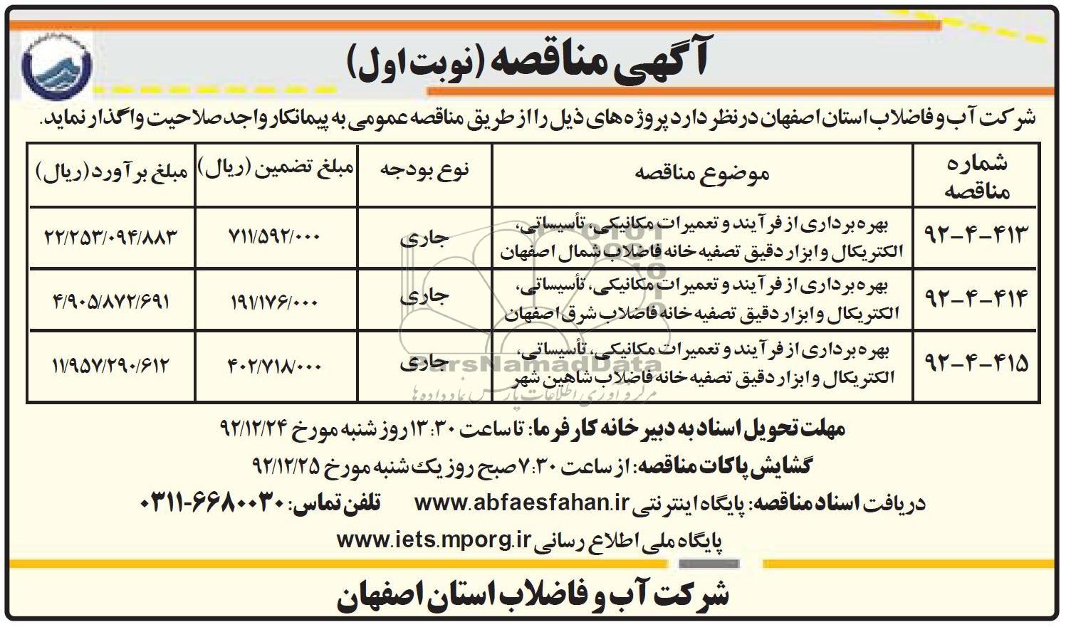 | 414-4-92 | بهره برداری از فرآیند و تعمیرات مکانیکی ، تاسیساتی ، الکتریکال و ابزار دقیق تصفیه خانه فاضلاب شرق اصفهان | 191.176.000 | 4.905.872.691 |
