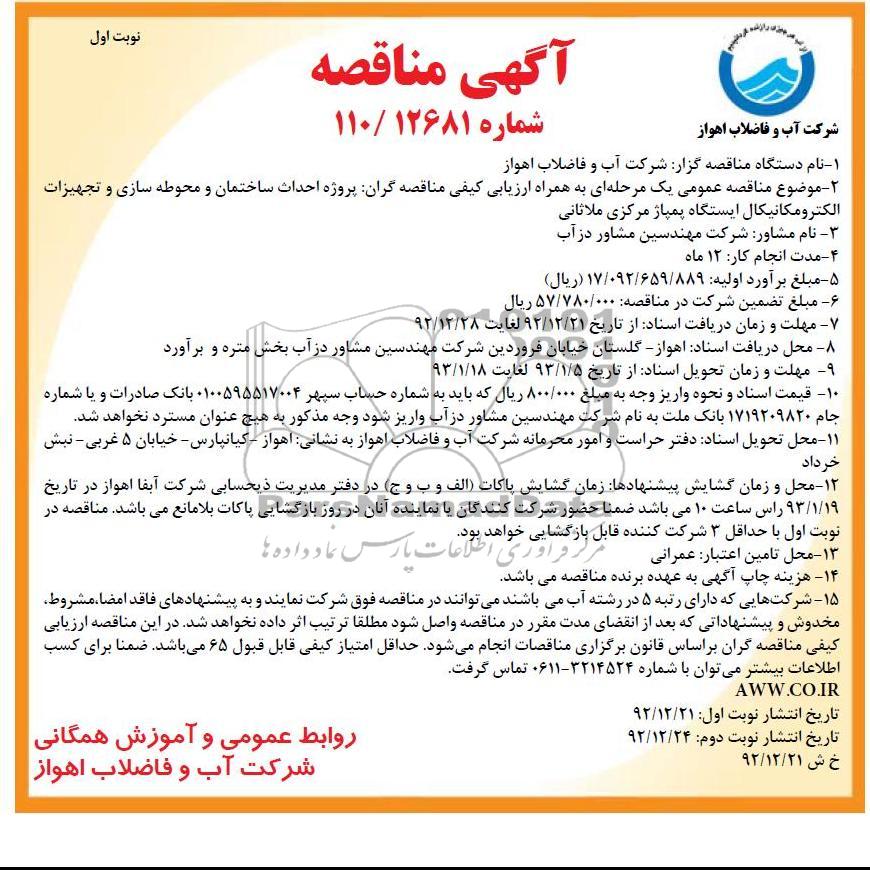 12- محل و زمان گشایش پیشنهادها: زمان گشایش پاکات الف و ب و ج در دفتر مدیریت ذیحسابی شرکت آبفا اهواز در تاریخ 93.1.19 راس ساعت 10 می باشد ضمنا حضور شرکت کنندگان یا نماینده آنان در روز بازگشایی پاکات بلامانع می باشد. مناقصه در نوبت اول با حداقل 3 شرکت کننده قابل بازگشایی خواهد بود.