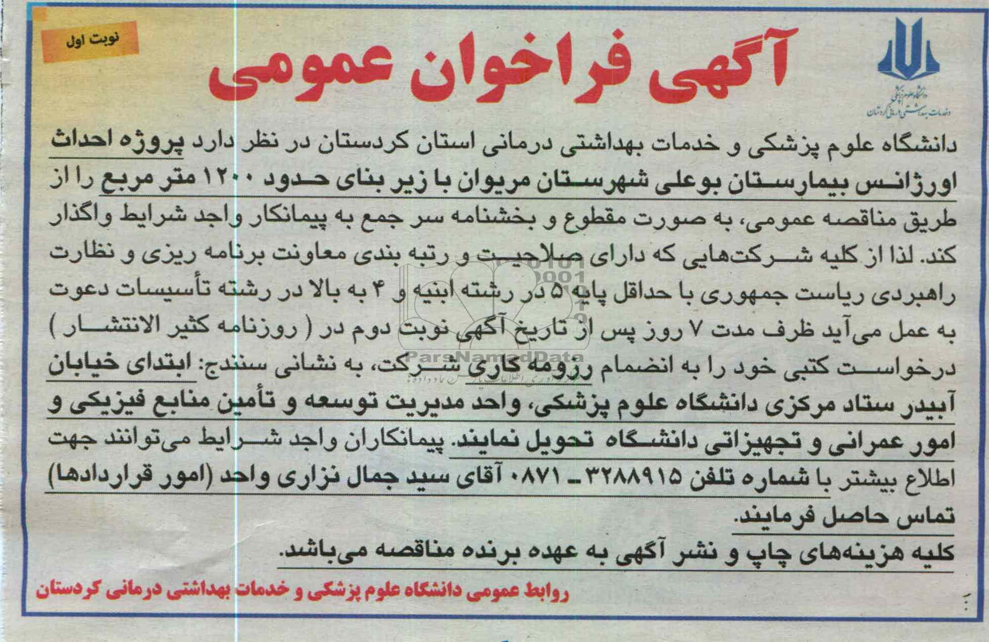لذا از کلیه شرکت هایی که دارای صلاحیت و رتبه بندی معاونت برنامه ریزی و نظارت راهبردی ریاست جمهوری با حداقل پایه 5 در رشته ابنیه و 4 به بالا در رشته تاسیسات دعوت به عمل می آید ظرف مدت 7 روز پس از تاریخ آگهی نوبت دوم در روزنامه کثیر الانتشار درخواست کتبی خود را به انضمام رزومه کاری شرکت ، به نشانی سنندج، ابتدای خیابان آبیدر ستاد مرکزی دانشگاه علومی ، واحد مدیریت توسعه و تامین منابع فیزیکی و امور عمرانی و تجهیزاتی دانشگاه تحویل نمایند.