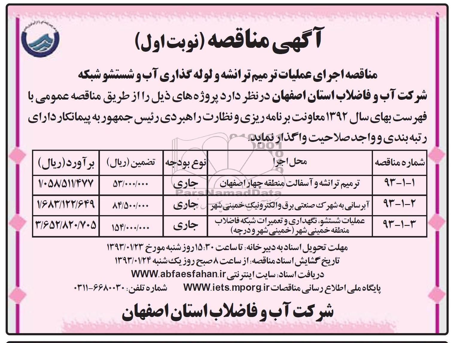 شرکت آب و فاضلاب استان اصفهان در نظر دارد پروژه های ذیل را از طریق مناقصه عمومی با فهرست بهای سال 1392 معاونت برنامه ریزی و نظارت راهبردی رئیس جمهور به پیمانکار دارای رتبه بندی و واجد صلاحیت واگذار نماید