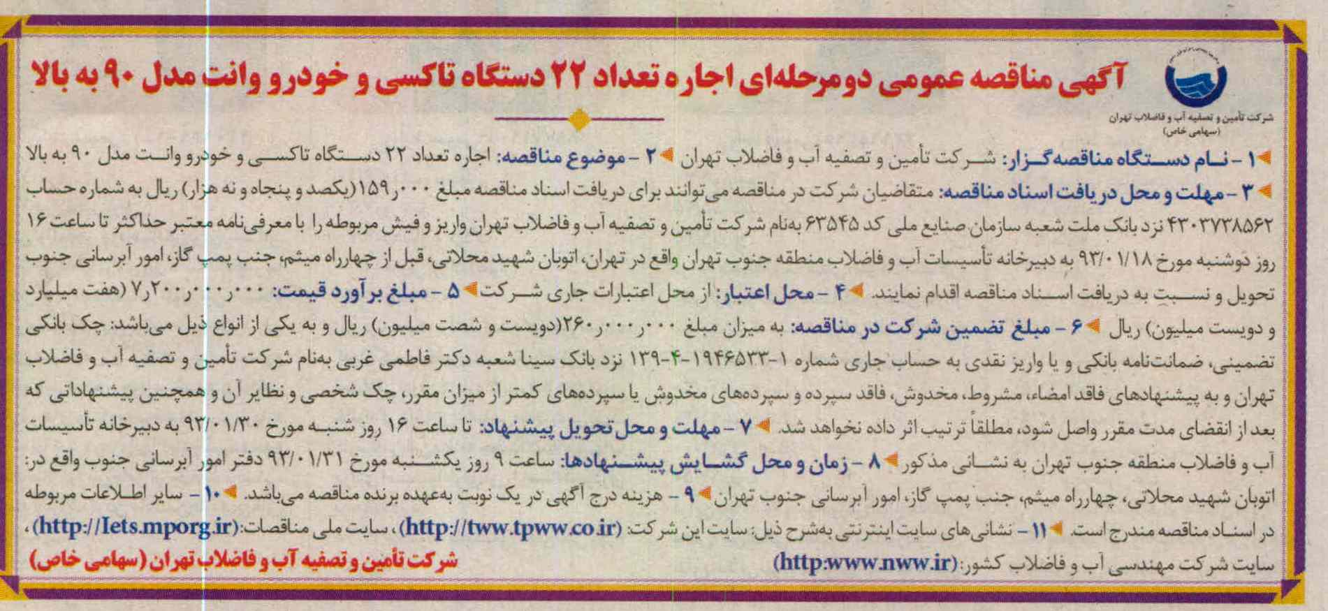 ۳- مهلت و محل دریافت اسناد مناقصه : متقاضیان شرکت در مناقصه می توانند برای دریافت اسناد مناقصه مبلغ 159.000(یکصد و پنجاه و نه هزار)ریال به شماره حساب ۴۳۰۳۷۳۸۵۶۲ نزد بانک ملت شعبه سازمان صنایع ملی کد ۶۳۵۴۵ به نام شرکت تامین و تصفیه آب و فاضلاب تهران واریز و فیش مر بوطه را با معرفی نامه معتبر حداکثر تا ساعت ۱۶:۰۰ روز دوشنبه مورخ 93.1.18 به دبیرخانه تأسیسات آب و فاضلاب منطقه جنوب تهران واقع در تهران ، اتوبان شهید محلاتی ، قبل از چهار راه میثم ، جنب پمپ گاز ، امور آبرسانی جنوب تحویل و نسبت به دریافت اسناد مناقصه اقدام نمایند.
