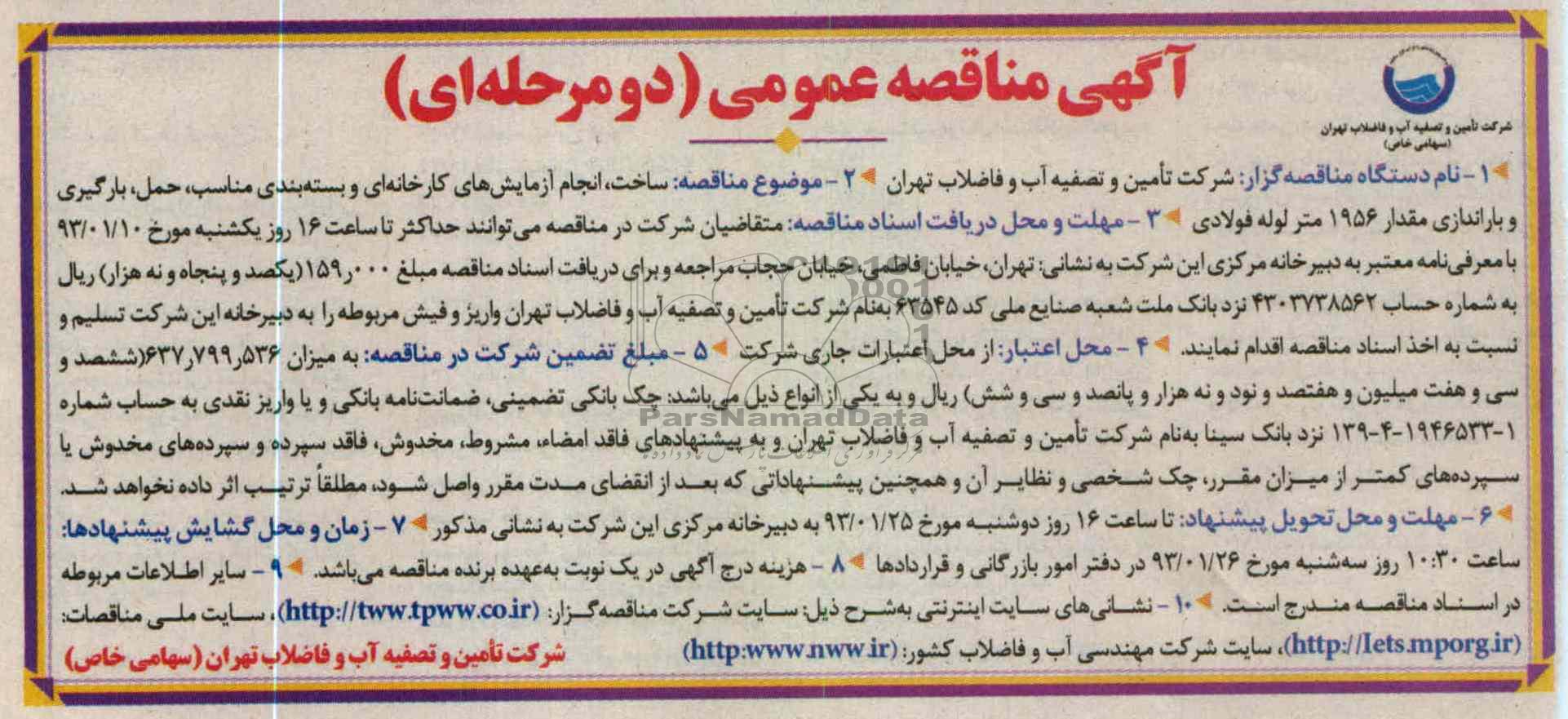 ۳- مهلت و محل دریافت اسناد مناقصه : متقاضیان شرکت در مناقصه می توانند حداکثر تا ساعت 16 روز یکشنبه مورخ 93.01.10 با معرفی نامه معتبر به دبیرخانه مرکزی این شرکت به نشانی تهران خیابان فاطمی خیابان حجاب مراجعه و برای دریافت اسناد مناقصه مبلغ 159.000(یکصد و پنجاه و نه هزار)ریال به شماره حساب ۴۳۰۳۷۳۸۵۶۲ نزد بانک ملت شعبه سازمان صنایع ملی کد ۶۳۵۴۵ به نام شرکت تامین و تصفیه آب و فاضلاب تهران واریز و فیش مر بوطه را به دبیرخانه این شرکت تسلیم و نسبت به اخذ اسناد مناقصه اقدا م نمایند