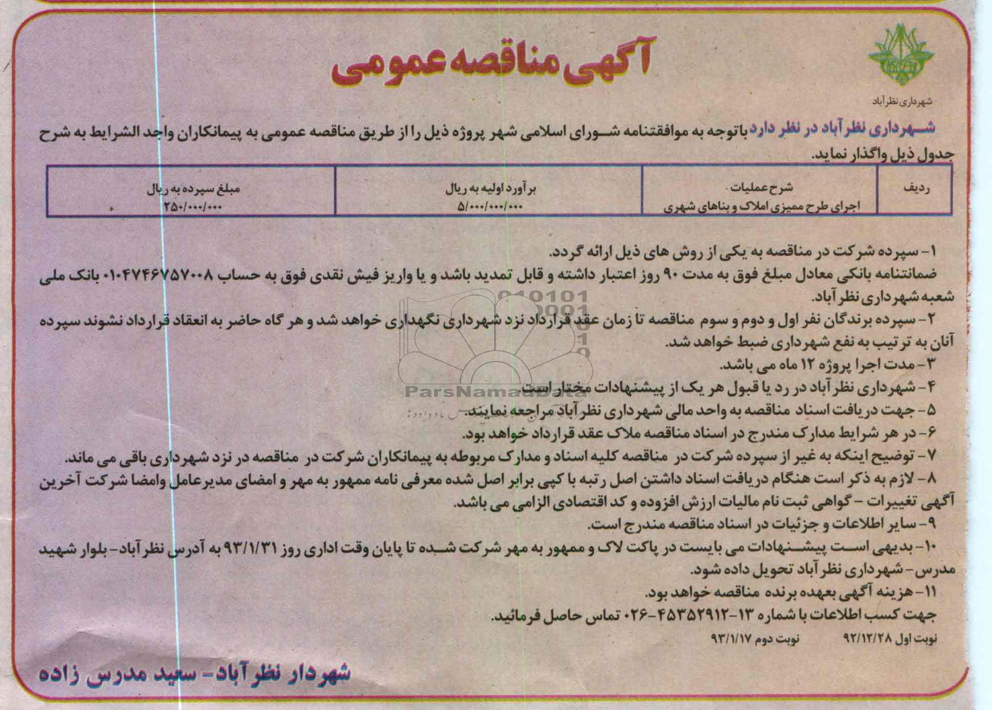 شهرداری نظرآباد در نظر دارد با توجه به موافقتنامه شورای اسلامی شهر پروژه ذیل را از طریق مناقصه عمومی به پیمانکاران واجد شرایط به شرح زیر واگذار نماید