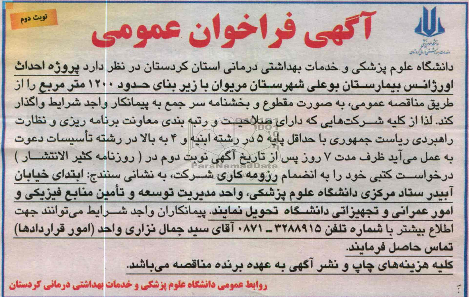 لذا از کلیه شرکت هایی که دارای صلاحیت و رتبه بندی معاونت برنامه ریزی و نظارت راهبردی ریاست جمهوری با حداقل پایه 5 در رشته ابنیه و 4 به بالا در رشته تاسیسات دعوت به عمل می آید ظرف مدت 7 روز پس از تاریخ آگهی نوبت دوم در روزنامه کثیر الانتشار درخواست کتبی خود را به انضمام رزومه کاری شرکت ، به نشانی سنندج، ابتدای خیابان آبیدر ستاد مرکزی دانشگاه علومی ، واحد مدیریت توسعه و تامین منابع فیزیکی و امور عمرانی و تجهیزاتی دانشگاه تحویل نمایند.