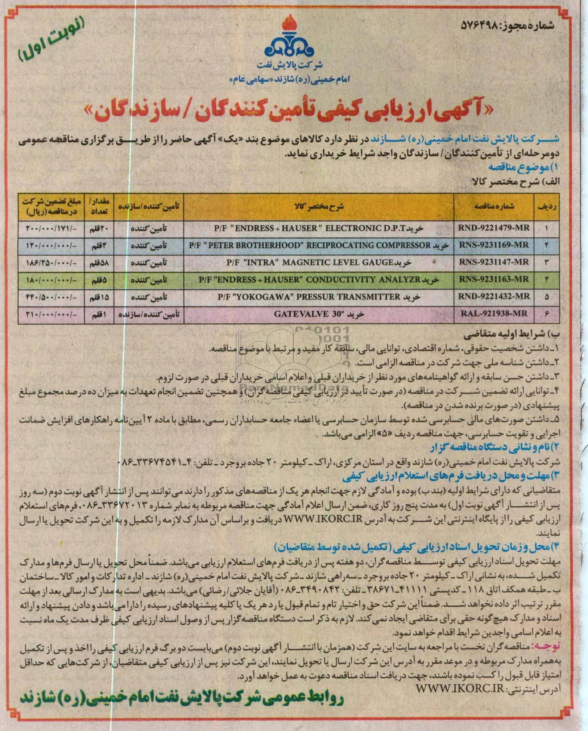 | RNS-9231163-MR | خرید P/F ENDTESS+HAUSER CONDUCTIVITY ANALYZR | تامین کننده | 5 قلم | 180.000.000 |