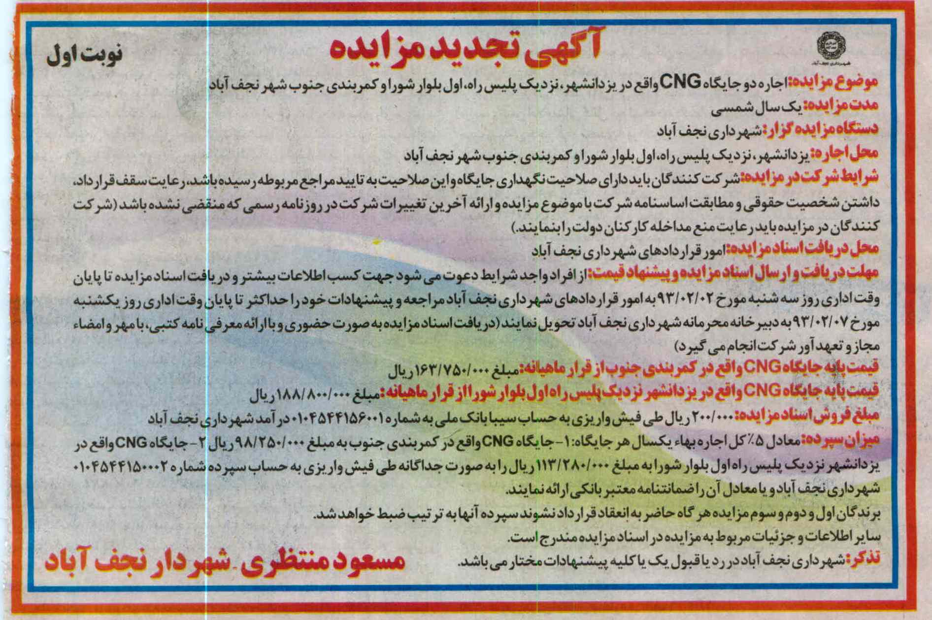 مهلت دریافت و ارسال اسناد مزایده و پیشنهاد قیمت: از افراد واجد شرایط دعوت می شود جهت کسب اطلاعات بیشتر و دریافت اسناد مزایده تا پایان وقت اداری روز سه شنبه مورخ 93.2.2 به امور قراردادهای شهرداری نجف آباد مراجعه و پیشنهادات خود را حداکثر تا پایان وقت اداری روز یکشنبه مورخ 93.2.7 به دبیرخانه محرمانه شهرداری نجف آباد تحویل نمایند (دریافت اسناد مزایده به صورت حضوری و با ارائه معرفینامه کتبی، با مهر و امضای مجزا و تعهد آور شرکت انجام می گیرد.