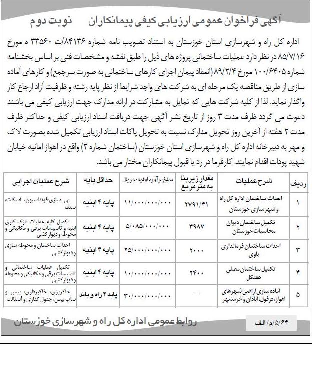 | 1 | احداث ساختمان اداره کل راه و شهرسازی خوزستان | 41/2791 | 11.000.000.000 | پایه 4 ابنیه | پی سازی - فوندسیون - اسکلت - سقف |