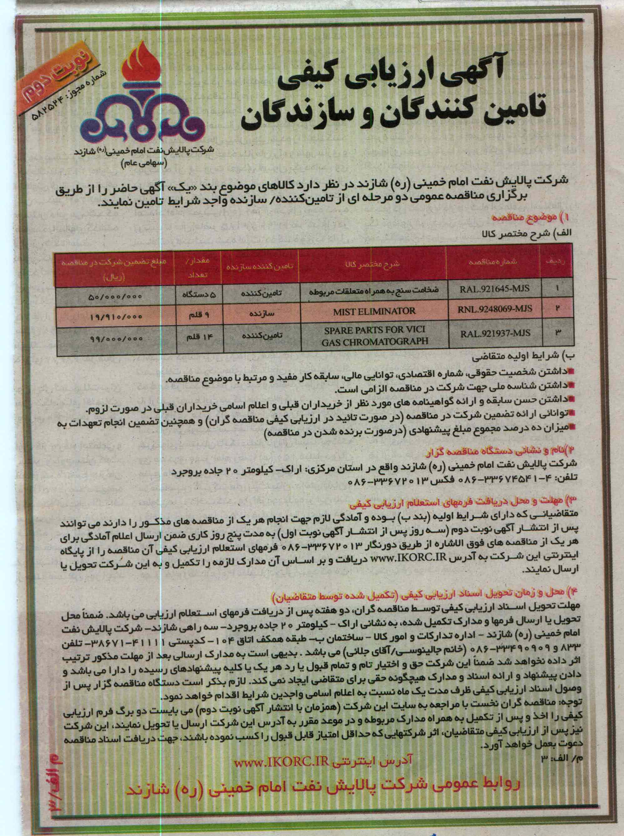 مهلت تحویل اسناد ارزیابی کیفی توسط مناقصه گران دو هفته پس از دریافت فرم های استعلام ارزیابی می باشد. ضمنا محل تحویل یا ارسال فرم ها و مدارک تکمیل شده به نشانی اراک - کیلومتر 20 جاده برودجرد - سه راهی شازند - شرکت پالایش نفت امام خمینی (ره) شازند - اداره تدارکات و امور کالا - کد پستی 41111-38671 ساختمان ب - طبقه همکف اتاق 104- تلفن 833 و 33490909-086(خانم جالینوسی / آقائی جلائی) می باشد. بدیهی است به مدارک ارسالی بعد از مهلت مقرر ترتیب اثر داده نخواهد شد. ضمنا این شرکت حق و اختیار تام و تمام قبول یا رد هر یک یا کلیه پیشنهادهای رسیده را دارا می باشد و دادن پیشنهاد و ارائه اسناد و مدارک هیچگونه حقی برای متقاضی ایجاد نمی کند. لازم به ذکر است دستگاه مناقصه گزار پس از وصول اسناد ارزیابی کیفی ظرف مدت یک ماه نسبت به اعلام اسامی واجدین شرایط اقدام خواهدنمود.