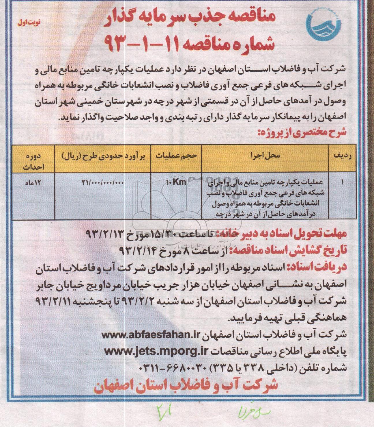 دریافت اسناد اسناد مربوطه را از اموز قراردادهای شرکت آب و فاضلاب استان اصفهان به نشانی اصفهان خیابان هزار جریب خیابان مرداویج خیابان جابر شرکت آب و فاضلاب استان اصفهان از سه شنبه مورخ 93.2.2 تا پنجشنبه 93.2.11 هماهنگی قبلی تهیه فرمایید