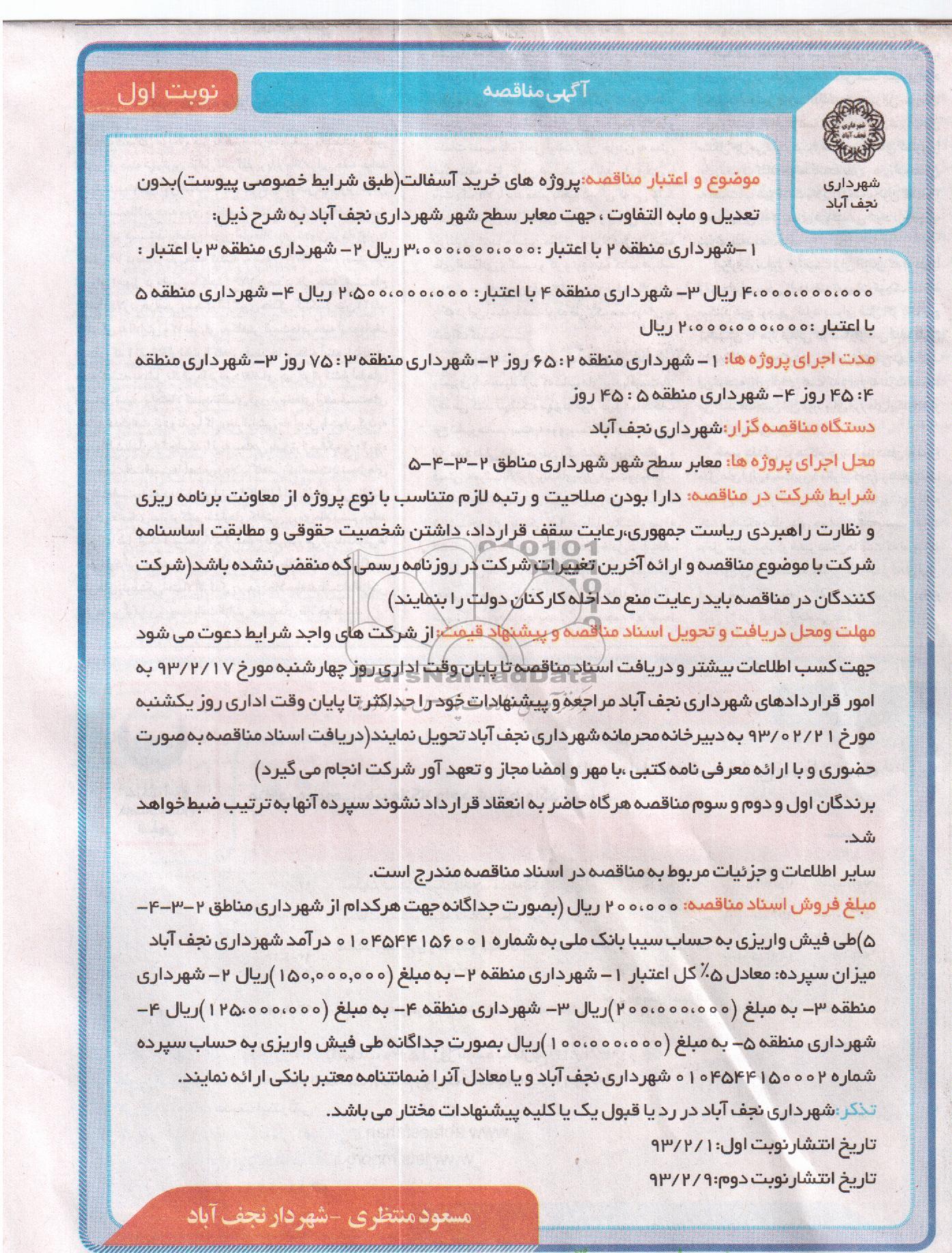 موضوع و اعتبار مناقصه: پروژه های خرید آسفالت (طبق شرایط خصوصی پیوست) بدون تعدیل و مابه التفاوت، جهت معابر سطح شهر شهرداری نجف آباد به شرح ذیل:
