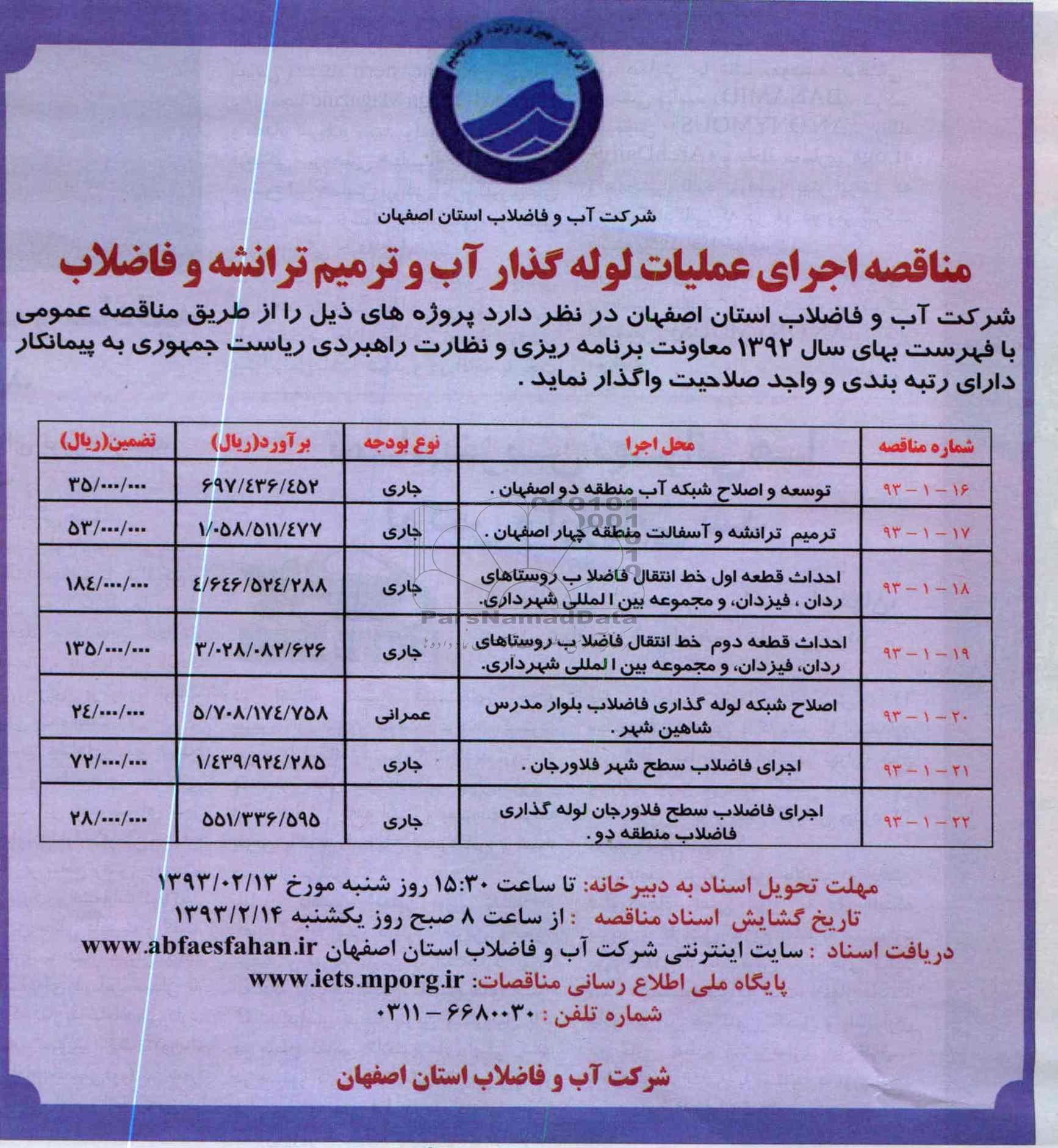 شرکت آب و فاضلاب استان اصفهان در نظر دارد پروژه های ذیل را از طریق مناقصه عمومی با فهرست بهای سال 1392 معاونت برنامه ریزی و نظارت راهبردی ریاست جمهوری به پیمانکار دارای رتبه بندی و واجد صلاحیت واگذار نماید.