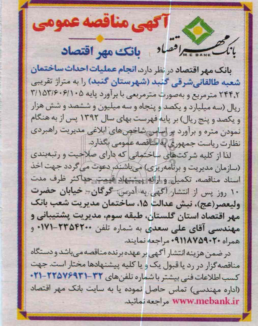 لذا از کلیه شرکت های ساختمانی که دارای صلاحیت و رتبه بندی ( سازمان مدیریت و برنامه ریزی) می باشند ، دعوت می گردد جهت اخذ اسناد مناقصه ، تکمیل و ارائه پیشنهاد قیمت حداکثر ظرف مدت 10 روز پس از انتشار آگهی به آدرس : گرگان - خیابان حضرت ولیعصر (عج) ، نبش عدالت 15 ، ساختمان مدیریت شعب بانک مهر اقتصاد استان گلستان ، طبقه سوم ، مدیریت پشتیبانی و مهندسی آقای علی سعدی به شماره تلفن 2354200-0171 همراه 09118759020