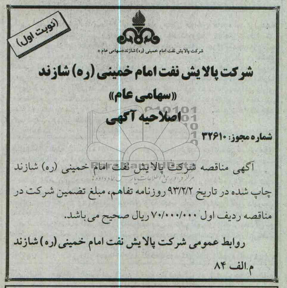 اگهی مناقصه شرکت پالایش نفت امام خمینی شازند چاپ شده در تاریخ 93.2.2 روزنامه تفاهم مبلغ تضمین شرکت در مناقصه ردیف اول 70.000.000 ریال صحیح می باشد