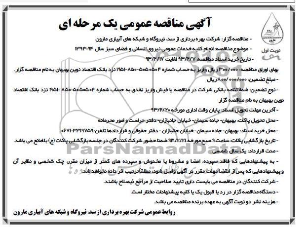 موضوع مناقصه: انجام کلیه خدمات عمومی نیروی انسانی و فضای سبز سال 94-1393