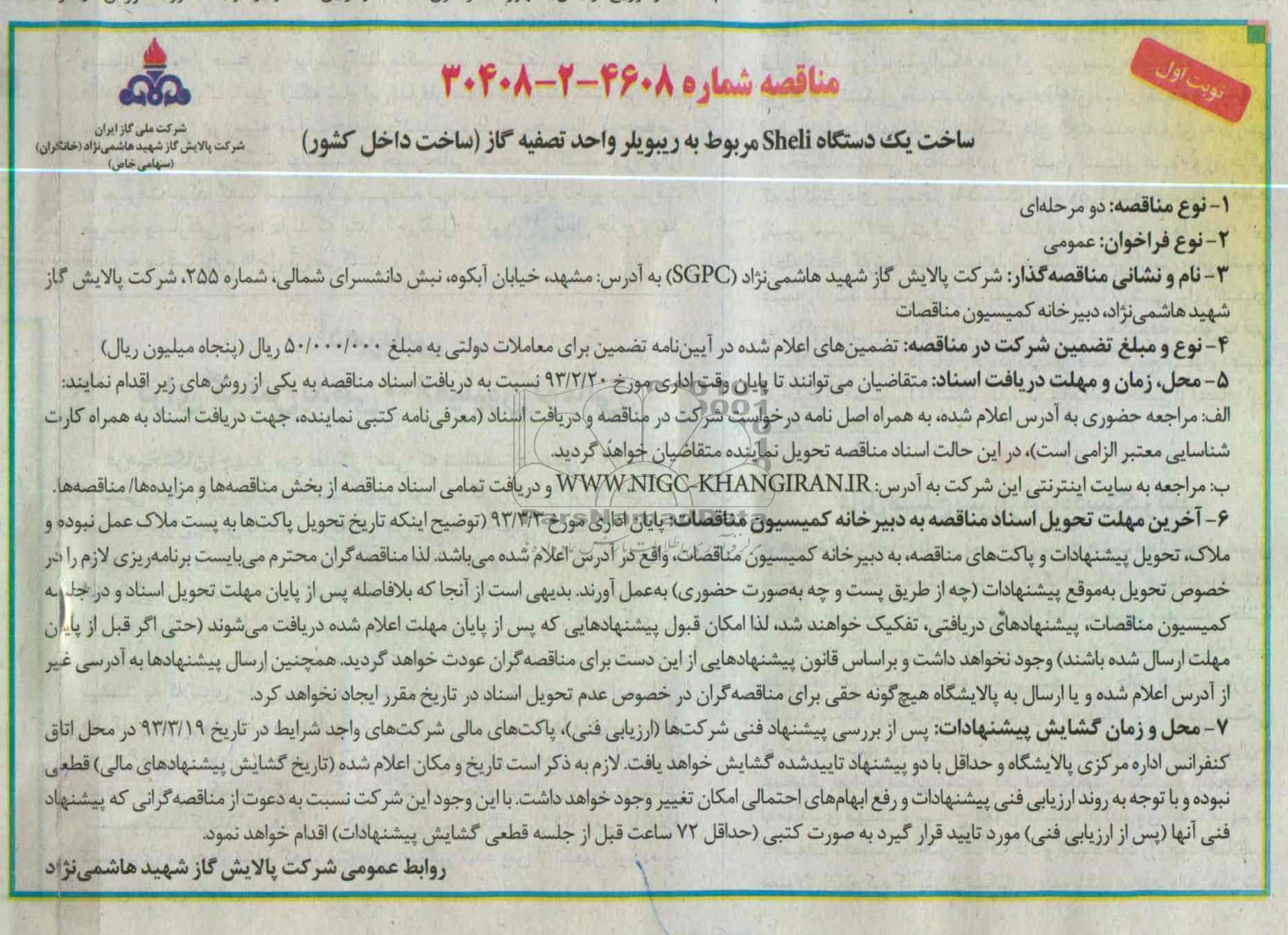 مناقصه, ساخت یکدستگاه SHELI مربوط به ریبویلر واحد ...