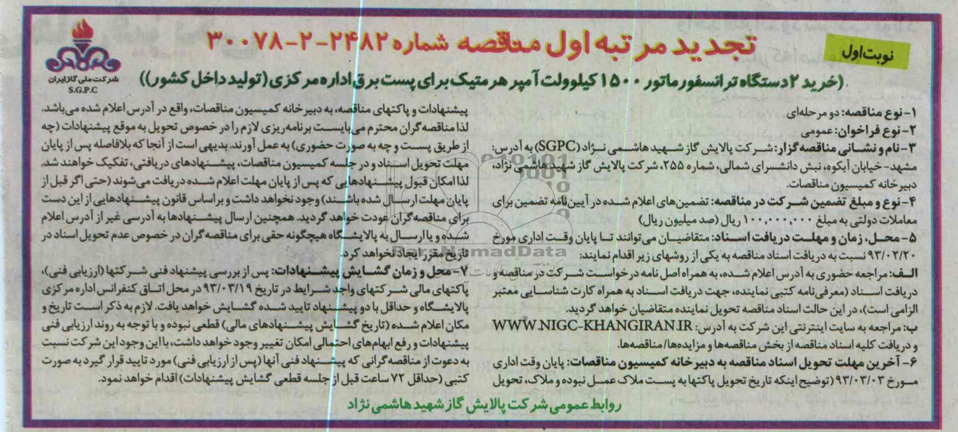 نام و نشانی مناقصه گزار: شرکت پالایش گاز شهید هاشمی نژاد (SGPC) به آدرس: مشهد، خیابان آبکوه، نبش دانشسرای شمالی، شماره 255، شرکت پالایش گاز شهید هاشمی نژاد، دبیرخانه کمیسیون مناقصات.